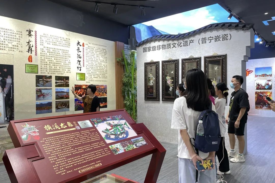 实践团在陈丹萍馆长带领下一同走进普宁市非物质文化遗产展示厅,首先,陈馆长非常热情地给我们介绍了普宁市文化特色遗产,包括嵌瓷文化、英歌舞蹈文化、李家教拳等非物质文化遗产,其中映入眼帘的视觉冲击是极具鲜明特色普宁英歌舞蹈的壮美和普宁嵌瓷的精湛,英歌与嵌瓷均属于国家级非遗代表性项目之一,更是普宁市饮誉中外的文化名片。
