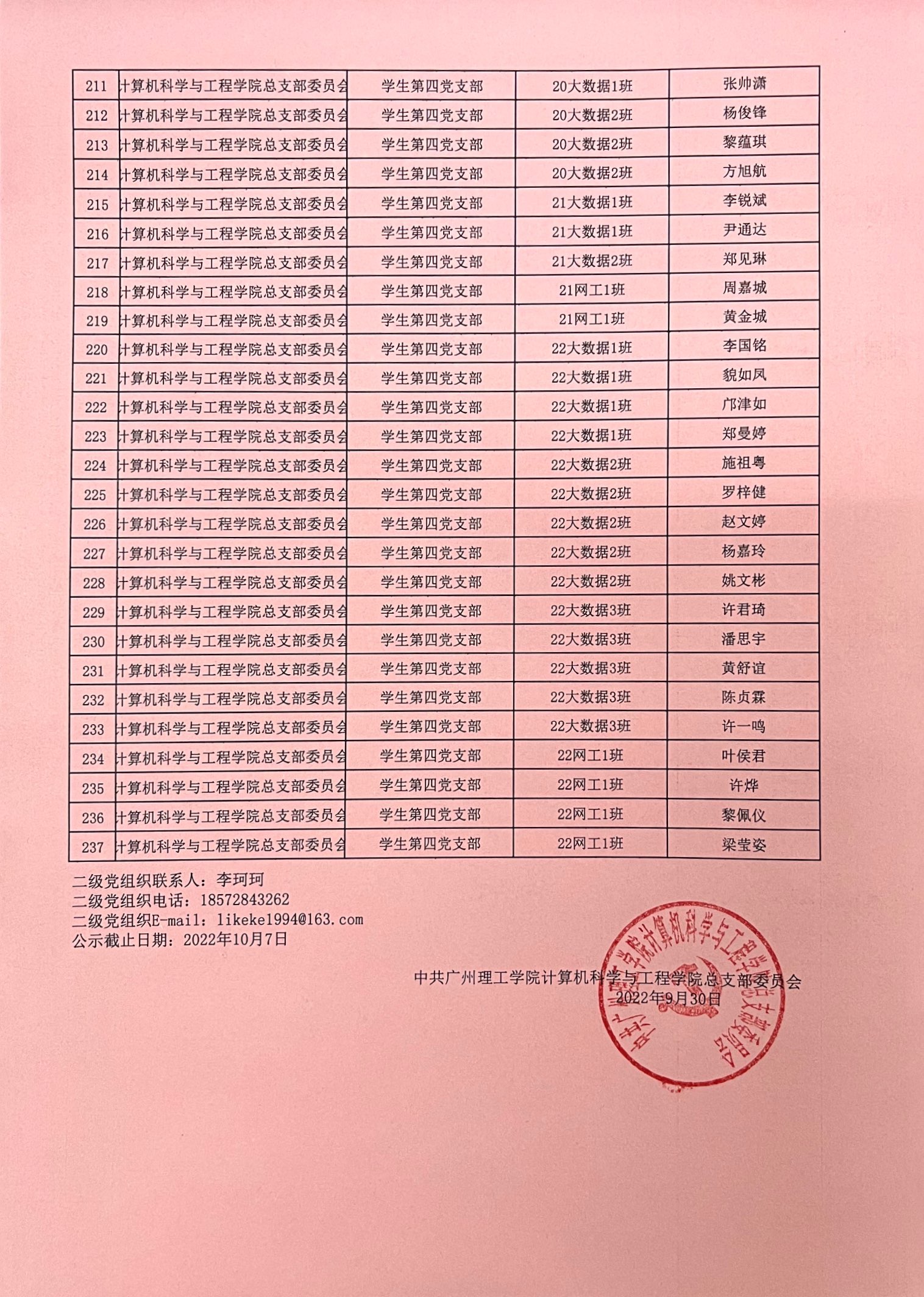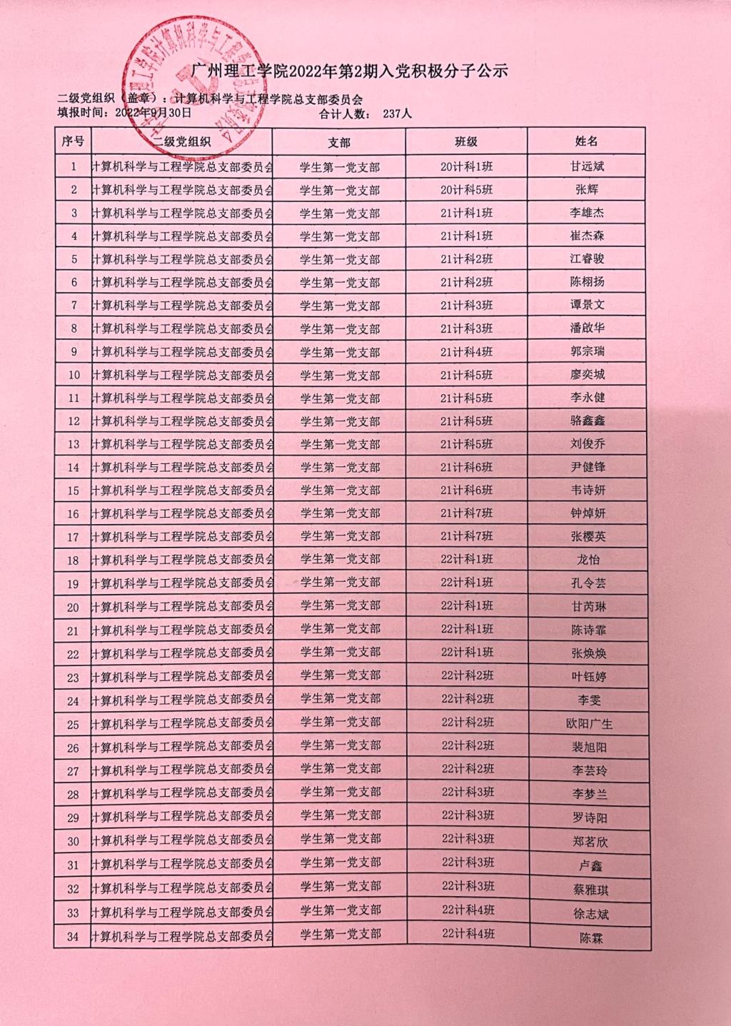 在听取培养联系人、党员和群众意见的基础上,经支部大会、支委会研究决定,拟推荐甘远斌等237名同志为2022年第2期入党积极分子。为了进一步增强发展党员工作的透明度,确保发展新党员的质量,根据《中国共产党发展党员工作细则》等文件的有关精神,现将积极分子名单公示如下,公示期7天,自2022年9月30日至2022年10月7日止。