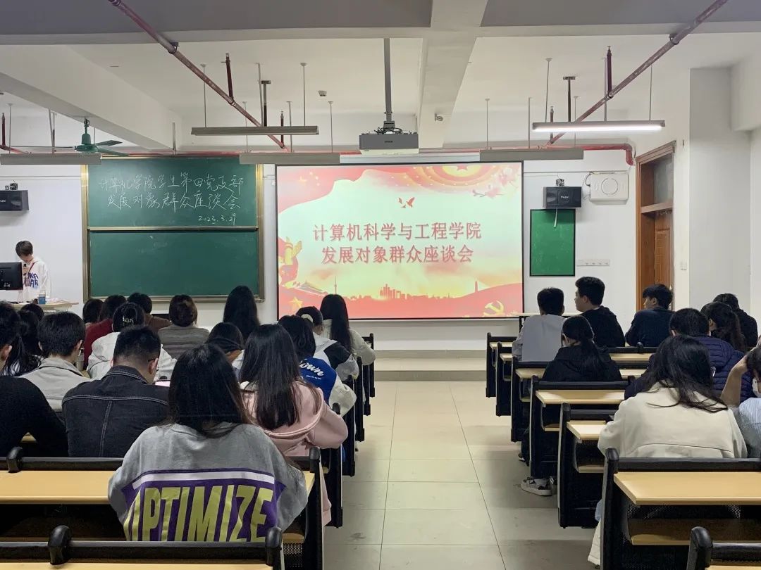 (通讯员:方奕旋)3月29日晚上,计算机科学与工程学院学生党支部于13栋教学楼701、702、703教室召开了拟发展对象党内外群众座谈会。本次会议分别由李爽、陈希、许君琦同志主持,各支部副书记、支部委员、全体学生党支部成员、各班班长及班级群众代表、2022-2期积极分子以及86名党员发展对象候选人参加了本次座谈会。