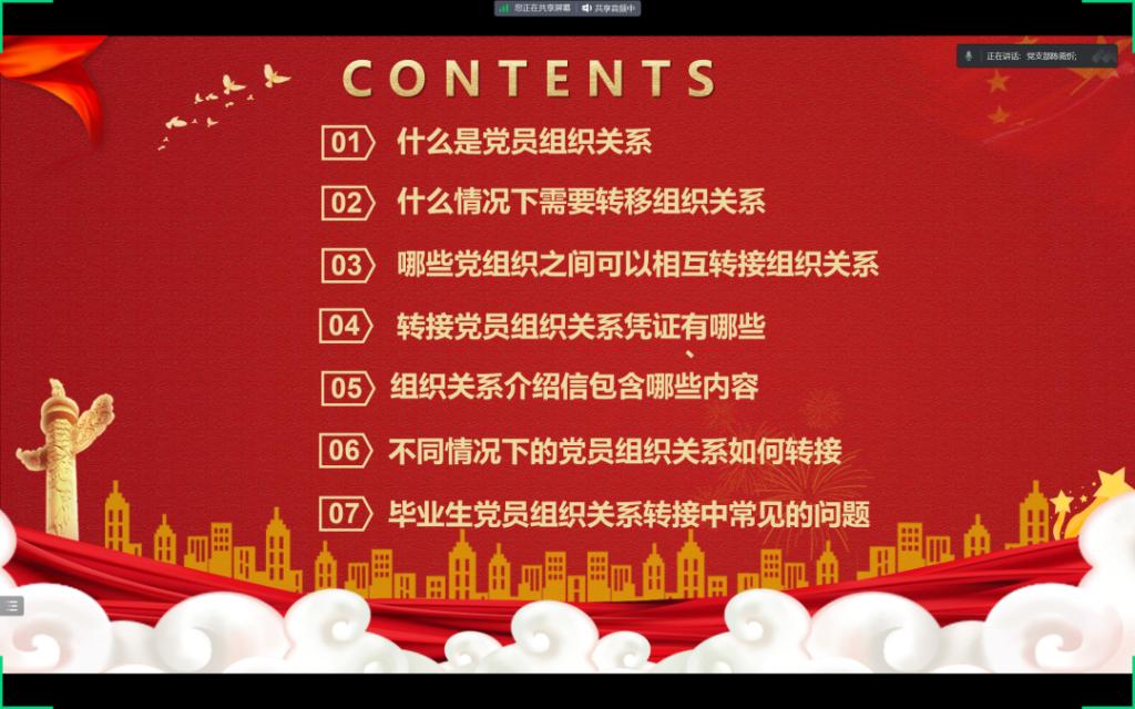 本次会议由陈菀忻同志主持。会上,陈同志就毕业生党员组织关系转接问题向大家做了详细介绍,她结合《中国共产党党员教育管理工作条例》,详解了党员组织关系的相关知识和党员组织关系转接的具体流程,针对学校毕业生的去向,强调了党员组织关系转接方法,并对组织关系转接中常见问题作了解答,提醒各位毕业生党员高度重视,尽快落实好党组织关系的接收单位,按时依规办理好党组织关系转出手续。