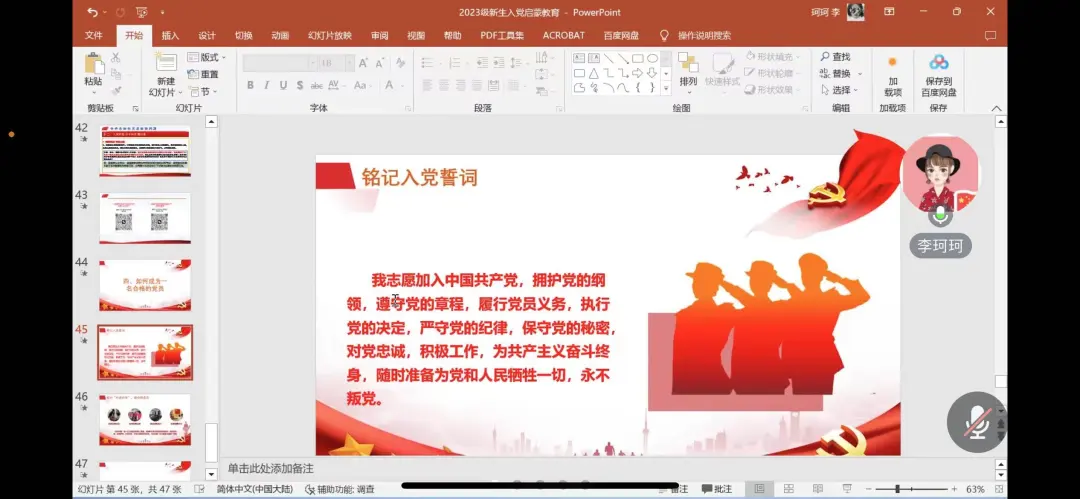 最后,李珂珂同志对全体专升本新生提出了殷切的期望,希望已经是党员的专升本新生能够践行“四讲四有”,做合格的党员,也希望还未入党的新生们能够积极提交入党申请书,争取早日成为一名光荣的中国共产党员。