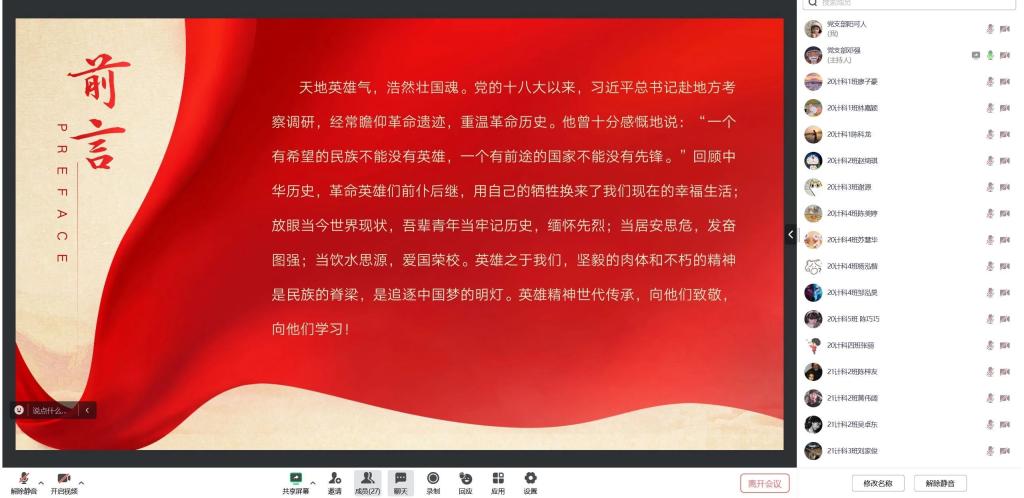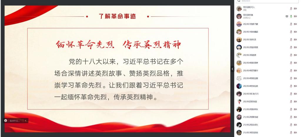 (通讯员:许君琦)2023年9月30日是第十个烈士纪念日,为缅怀革命先烈、弘扬爱国主义精神,10月19日下午,计算机科学与工程学院学生第一、二、三、四党支部于线上召开“缅怀革命先烈,传承红色血脉”专题学习会,全体党员同志、学生党支部工作成员按时参会。