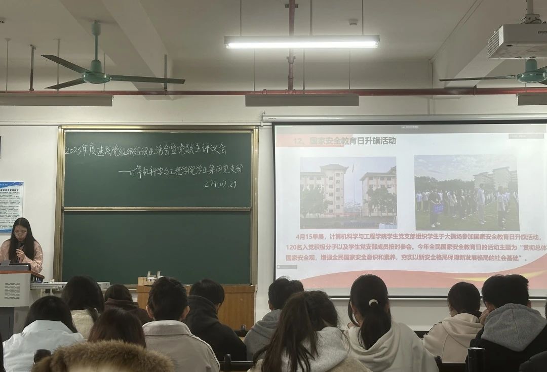 本次会议主要流程如下:一是报告2023年度党支部工作情况;二是各支部副书记带领全体党员学习《党史学习教育工作条例》;三是全体党员进行批评与自我批评并进行民主党员评定;四是各支部副书记作会议总结;五是全体党员重温入党誓词并宣誓。在2023年中,计算机科学与工程学院学生党支部开展了一系列发展党员工作及党日活动,为党员队伍注入新的活力,亦引领党员增强相互间的沟通合作,强化党组织的凝聚力。《党史学习教育工作条例》以习近平新时代中国特色社会主义思想为指导,以党章为根本依据,是开展党史学习教育工作的基本遵循。学习《党史学习教育工作条例》,使党员树立正确的党史观,把学习成果转化为更强大的工作动力。开展批评与自我批评,是党在长期革命和建设实践中形成的优良作风。全体党员通过批评与自我批评,更加深入地剖析了自身问题,基于自身问题作出改变,不断地完善自我、提升自我。学生第一党支部副书记刘家俊同志对本次会议作出总结。他表示:“希望各位党员以民主评议工作为契机,在本岗位发挥先锋模范作用;同时要克服自身的不足,在日常工作中广泛征求群众的意见和建议,使全体党员在各自的岗位上发挥作用。”