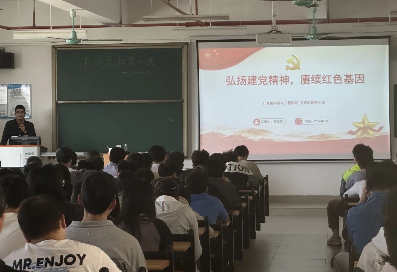 (通讯员:陈彩风)思政引领,铸魂育人。为深入学习贯彻习近平新时代中国特色社会主义思想和党的二十大精神,切实做好学生理想信念教育和价值引领,3月20日下午,计算机科学与工程学院党总支书记蔡岳良为同学们讲授2024年春季学期“思政第一课”,9428cn太阳集团古天乐各年级入党积极分子、发展对象、2021级计算机科学与技术学生代表均按时到场参加。