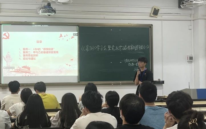 会议首先由学生第一党支部副书记刘家俊同志对《中国共产党纪律处分条例》(新修)(以下简称《条例》)的背景和意义进行了介绍。他指出,新修订的《条例》是党中央根据新形势下党的建设新的伟大工程的要求,对党的纪律建设作出的重要制度安排,对于加强党的纪律建设,保持党的先进性和纯洁性具有重要意义。在学习典型案例环节,各支部领学人通过分析近年来发生的违纪违法案例,警示全体党员要从中吸取教训,时刻保持警醒,严于律己,清正廉洁,不触碰纪律的红线。他们强调学生党员作为党的新鲜血液,要带头学习党的纪律,带头遵守党的纪律,带头维护党的纪律。