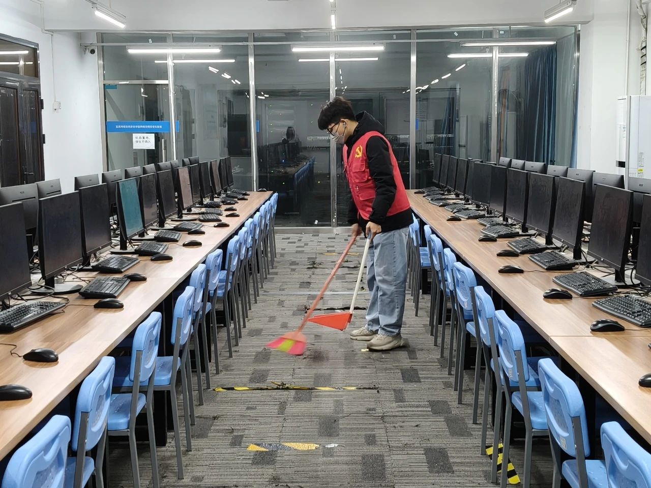 下午2点多,40位学生志愿者带着清洁工具准时到达4栋信息楼大厅,有序地分为三组,跟随党支部工作人员到达各层的教室开展打扫活动。学生志愿者们对各个教室做了全面地清扫,桌椅下的灰尘、角落里的碎屑全都无所遁形。学生志愿者组成小队,合作完成清扫工作,他们细致入微、态度认真地进行清扫,不遗漏任何一处细节。可见我院学生勤勉务实的工作态度和认真严谨的工作风貌。在学生志愿者们一丝不苟地整理下,学生和老师的工作学习环境再一次变得干净整洁。