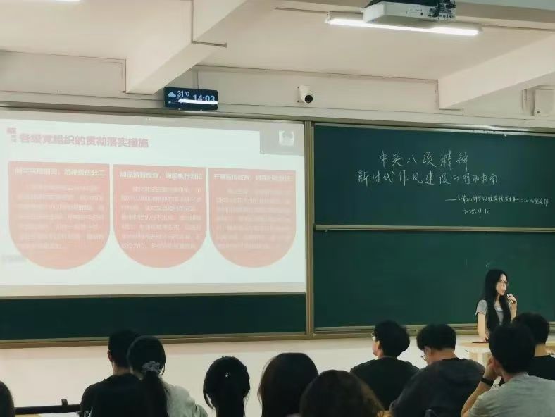会上,学生第四党支部副书记阳可人同志详细阐述了中央八项规定精神的概述、落实与成效、长期坚持与深化、与全面从严治党的关系以及未来展望。通过生动的案例,党员们对中央八项规定精神有了更加直观和深刻的理解。