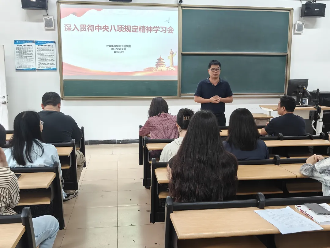 (通讯员:陈彩风)为深入贯彻落实全面从严治党要求,加强高校党风廉政建设,提升教工党员的纪律意识和作风素养,计算机科学与工程学院教工党支部于5月29日在经管楼110室成功举办了深入贯彻中央八项规定精神学习教育专题学习会。此次学习会由党支部副书记陈星莹主持,支部全体教工党员积极参与,围绕中央八项规定精神展开深入学习与交流。
