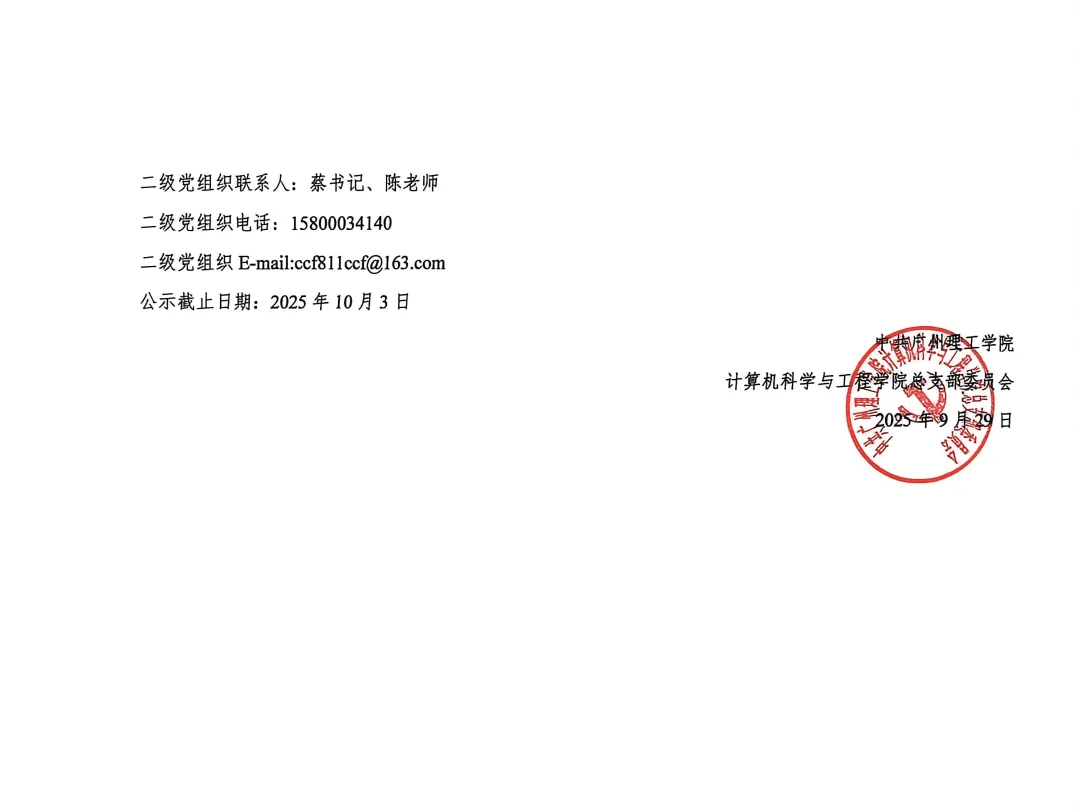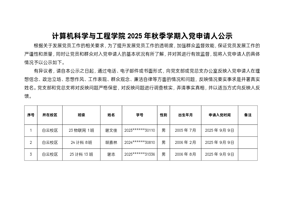 计算机科学与工程学院2025年秋季学期入党申请人补充公示