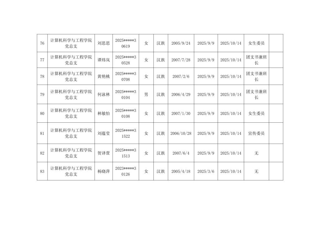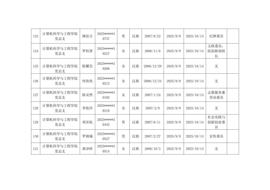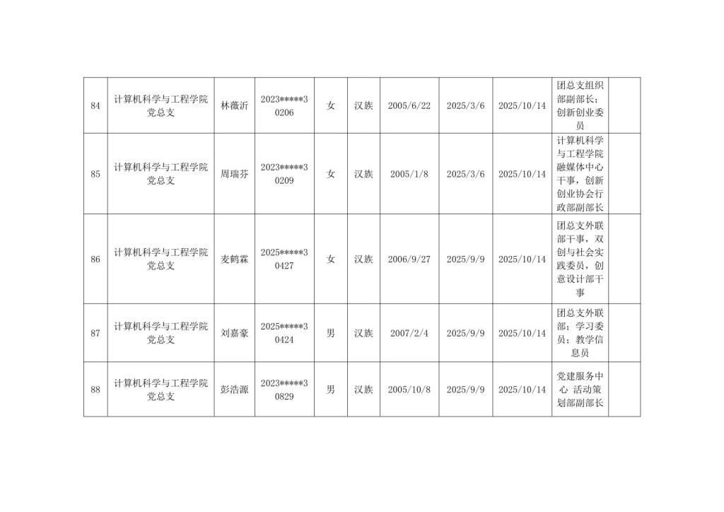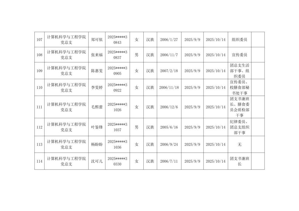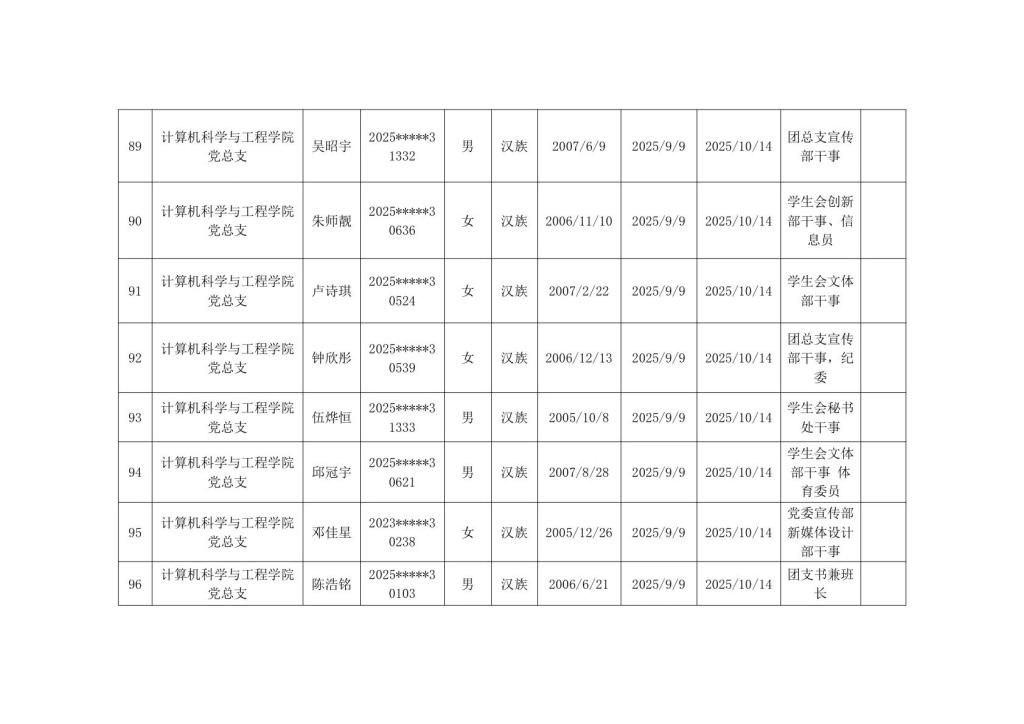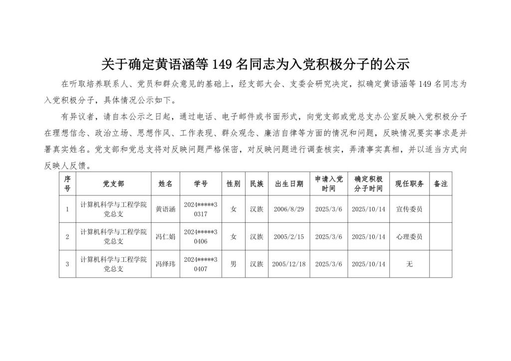 计算机科学与工程学院2025年秋季学期入党积极分子公示