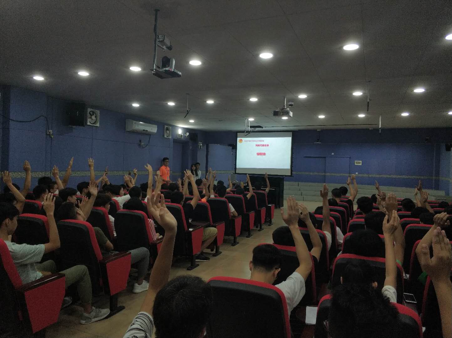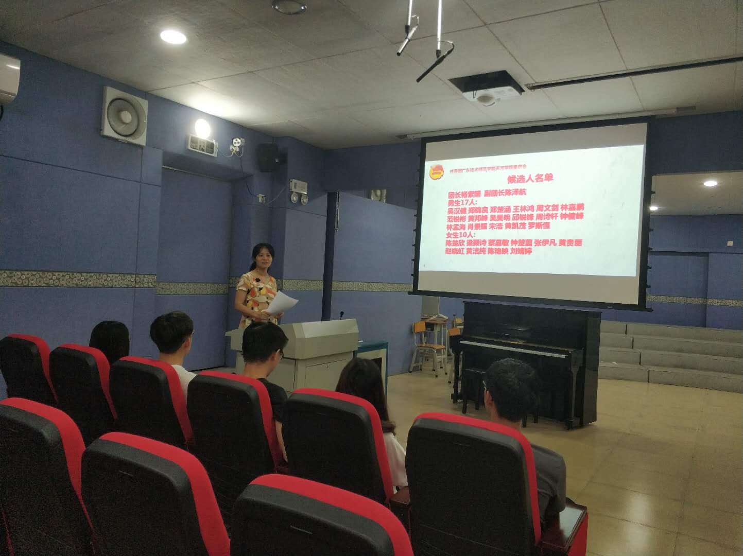 正式选举前,由主持人宣读候选人名单,通过选举方式:由学院团员代表举手表决选举正式代表、列席代表。然后,我院100多名团员代表采取举手表决的方式,在监票人的监督下,计票人统计投票结果,从29名候选人名单中,选举出24名团员正式代表、1名列席代表。我院杨紫晴书记公布此次大会表决通过的结果:吴汉健、陈楚欣等24位团员当选为第三次团代会代表候选人,银朝珠当选为列席代表。
