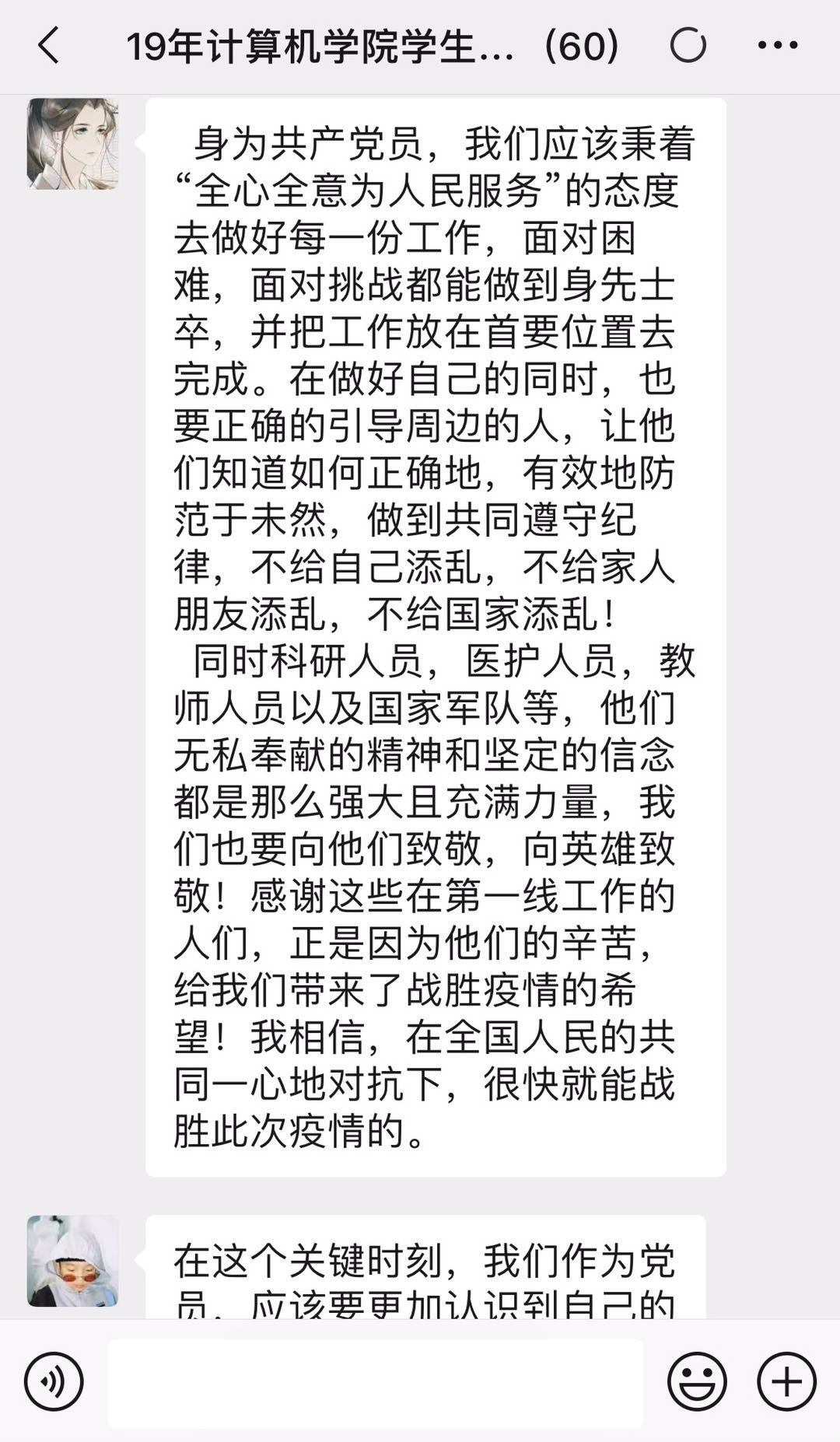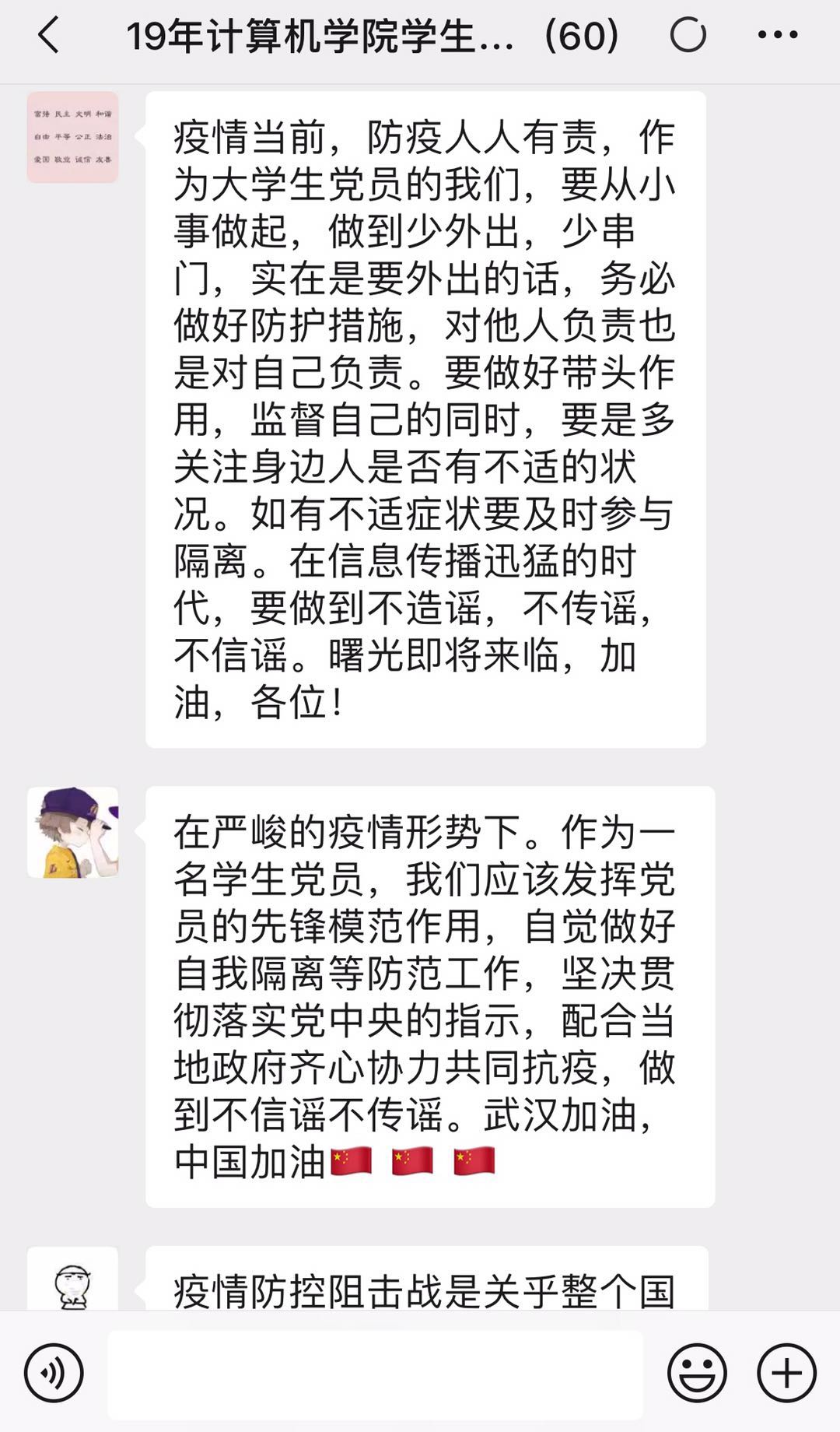 为深入学习贯彻习近平总书记对新型冠状病毒感染的肺炎疫情的重要指示精神,落实校党委相关工作部署,进一步加强党建引领,发挥学生党支部在防疫控疫工作中的战斗堡垒作用,3月2日,计算机科学与工程学院学生党支部组织全体学生党员开展线上专题组织生活会学习活动。