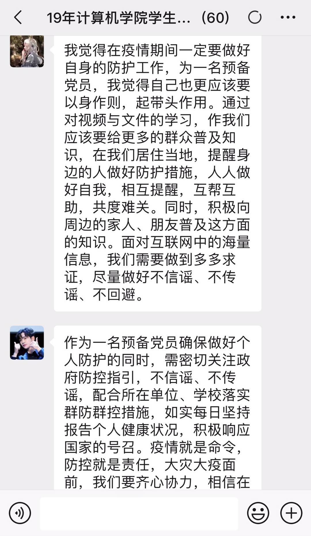 最后,学生党支部书记范明娟同志表示:在这场没有硝烟的战场上,无数共产党员“请战出征”,坚守在防控疫情斗争一线,每个共产党员都在这场战斗中做着自己力所能及的事情,有的党员不远万里向武汉输送物资,有的党员在医院建筑工程中挥洒汗水,不眠不息,与时间赛跑,让党旗在防控疫情斗争第一线高高飘扬。作为一名大学生党员,我们更应保持清醒头脑,提高辨别能力,相信科学的力量,不造谣、不信谣、不传谣,共同营造科学防治、理性应对的社会氛围,这就是对疫情防控的最大支持。