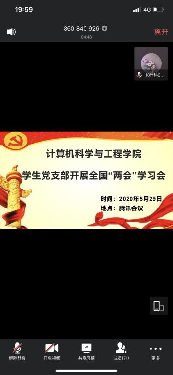 (通讯员:范明娟)两会年年开,今年有不同。常态化疫情防控背景下召开的2020年全国两会,日程短了、形式变了,但初心不改、使命不渝。为了贯彻落实学习此次全国“两会”精神,5月29日,计算机科学与工程学院学生党支部组织学生党员开展了线上学习分享会。