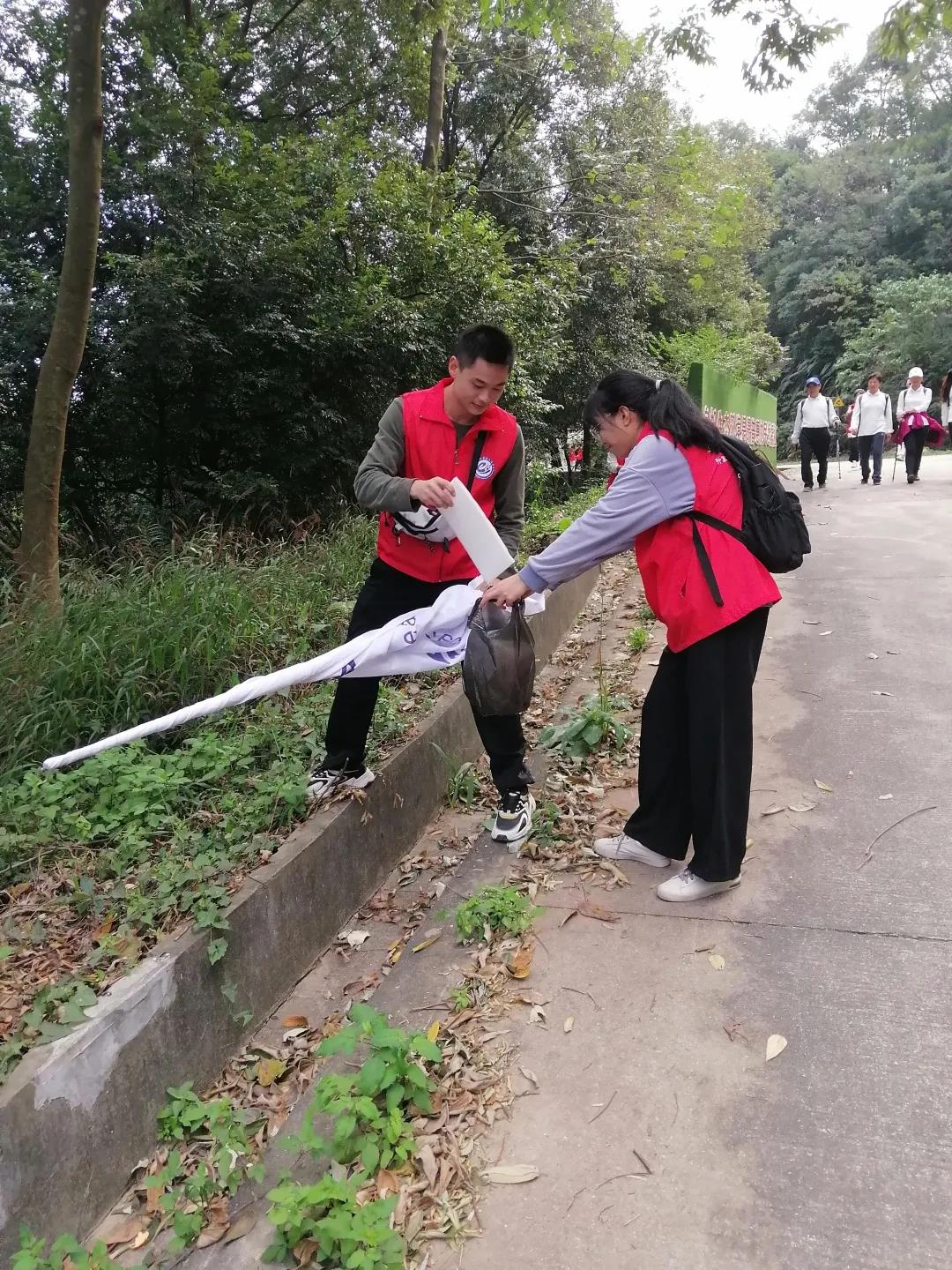 (通讯员:梁津铭)12月11日,计算机科学与工程学院志愿者来到帽峰山森林公园,开展“保护帽峰山,人人有责”公益活动。志愿者们手提垃圾袋,大到塑料瓶、手提袋,小到废纸、烟头,经过两个小时的劳动,每个人的塑料袋都“战果累累”,他们分工合作,将垃圾分类集中投放到垃圾桶内。