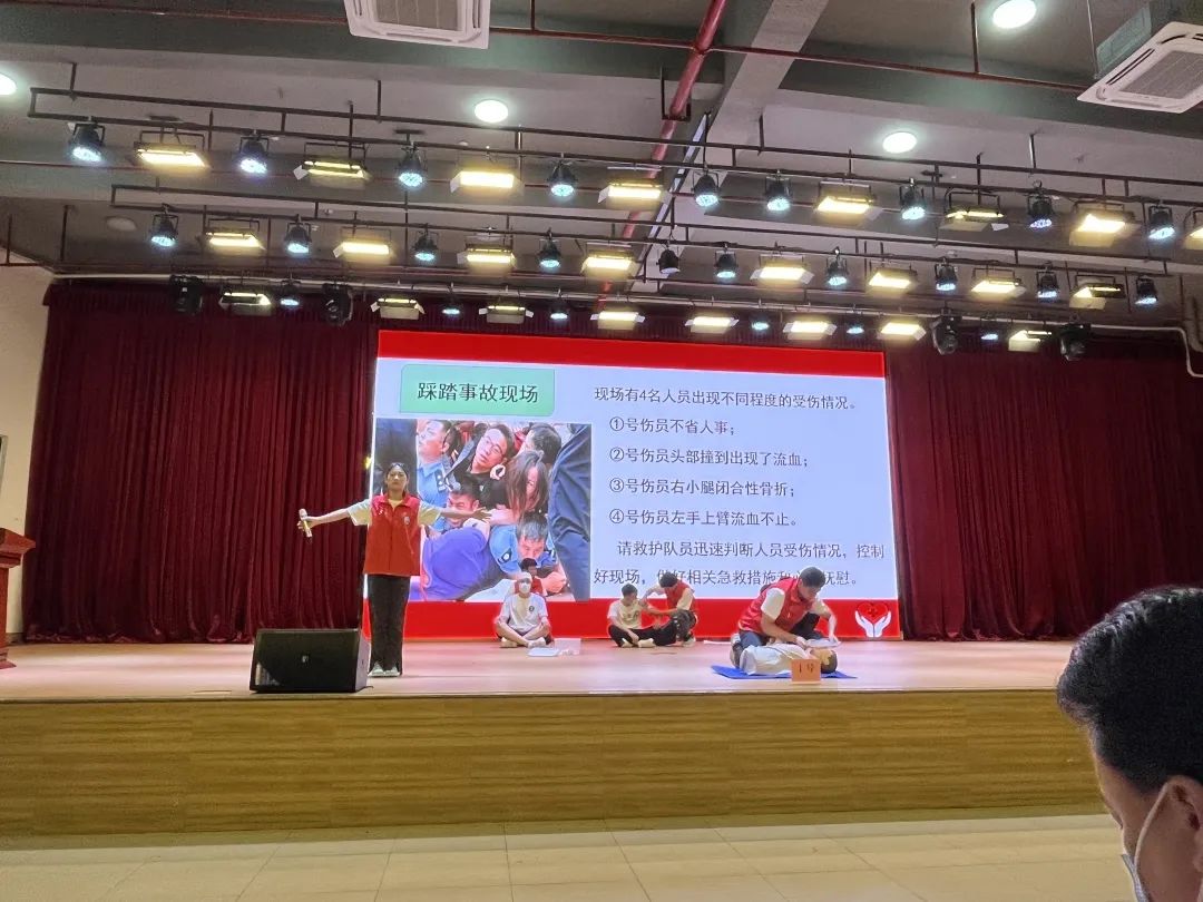 本次竞赛分为三个环节,分别是场景演练,理论问答以及救护演讲。我院参赛队员在每一个竞赛的环节中,运用自己所学知识,发挥自己的特长优势。拿出自己在训练时的拼搏力量落实到竞赛场上的每一个细节。其中,在场景演练过程中,我院救援的场景是踩踏事故现场,现场有4名人员出现不同程度的受伤情况。1号伤员心脏骤停,2号伤员头部撞到出现了流血,3号伤员右小腿闭合性骨折,4号伤员左手上臂流血不止。救护队员们迅速判断人员受伤情况,控制好现场,做好相关急救措施和伤员心理抚慰。我院进行心肺复苏的参赛队员严格遵守心肺复苏操作环节的每一个步骤,生怕出一丁点的错误。其余参赛队员也仔细认真负责的为现场受伤的每一位伤者进行救援,并及时进行心理抚慰。在规定时间内完成救援任务。