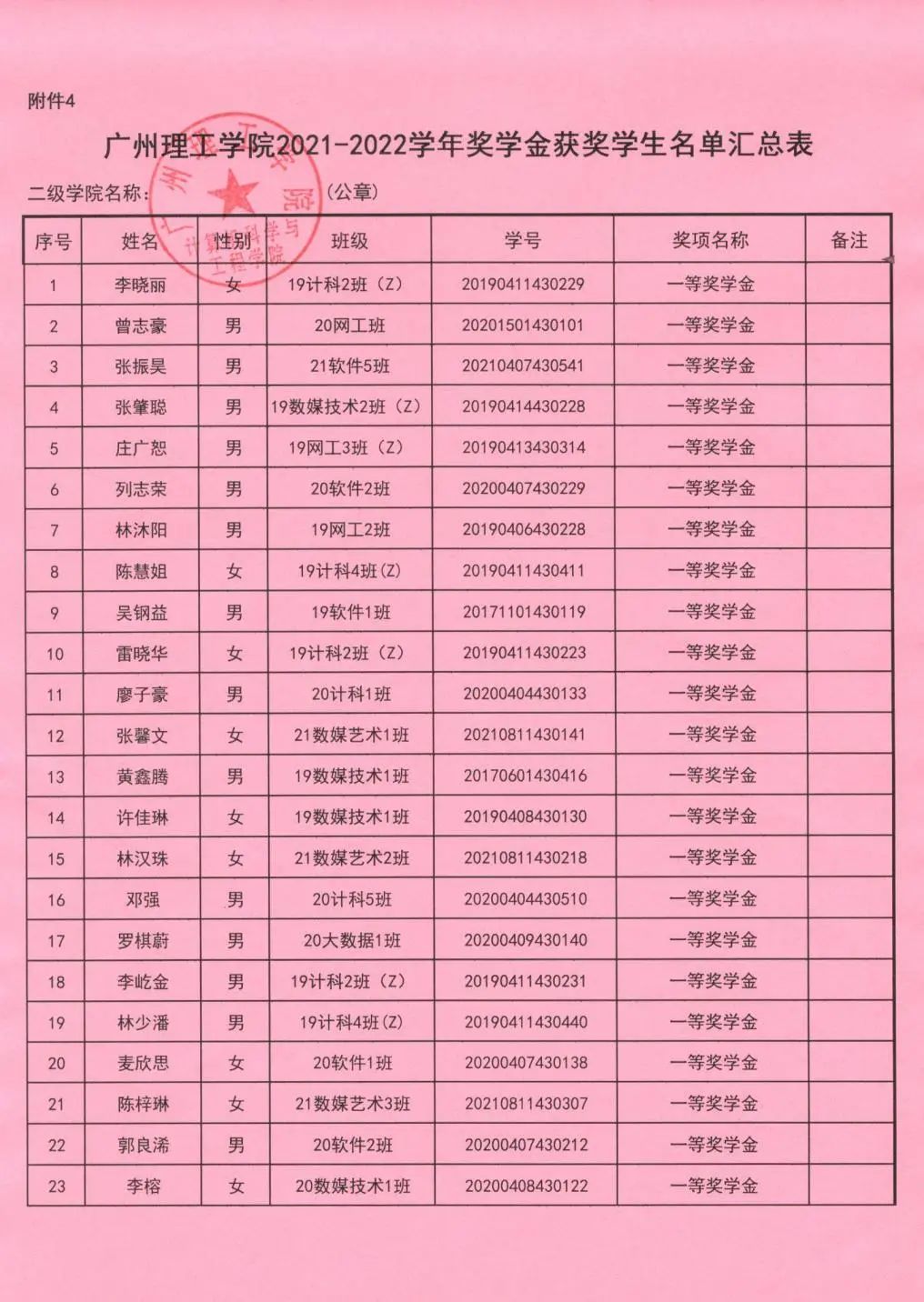 计算机科学与工程学院2021-2022学年奖学金获奖者中,有4名同学暂不符合,根据《广州理工学院学生奖励办法》的相关规定,将其调整为:20计科1班林嘉颖,20计科4班邹泓昊,20网工班曾志豪,19软件1班王汉添。公示时间:2022年9月18日-9月20日。
