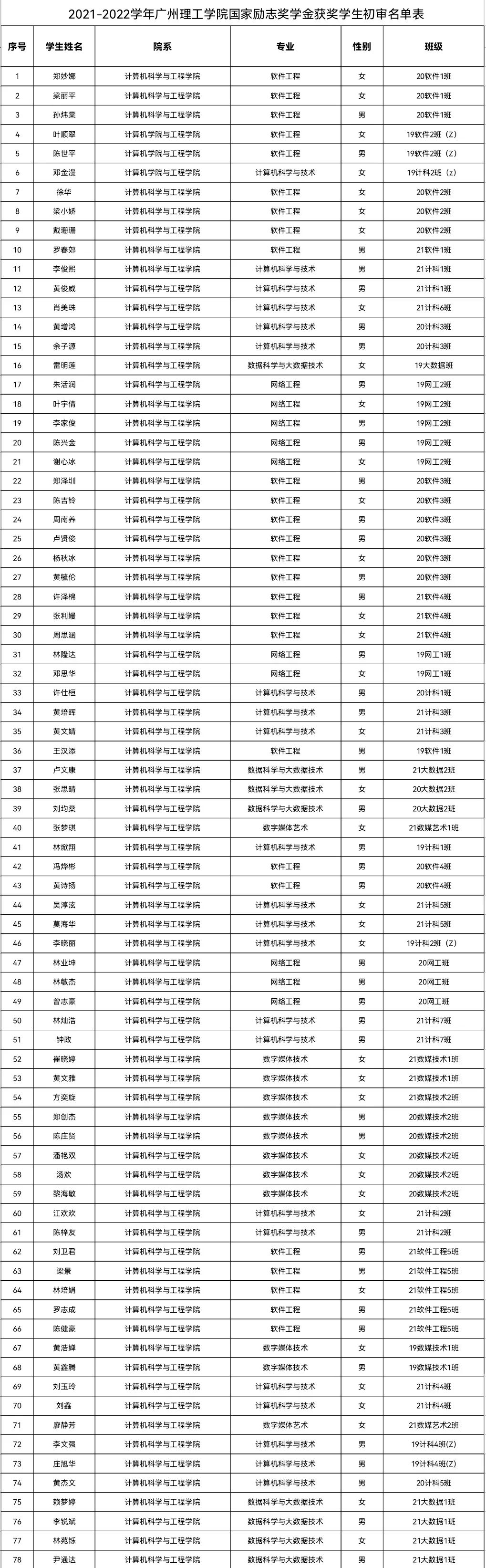根据《关于开展2021—2022学年国家励志奖学金评选工作通知》(广州理工助函〔2022〕7号),按照公平、公开、公正的原则,经公示反馈后,谭某某因为成绩计算有误,现将其更换为19计科2班(z)邓金漫,其余名单不变,重新公示如下,时间为2022.9.23-9.25。