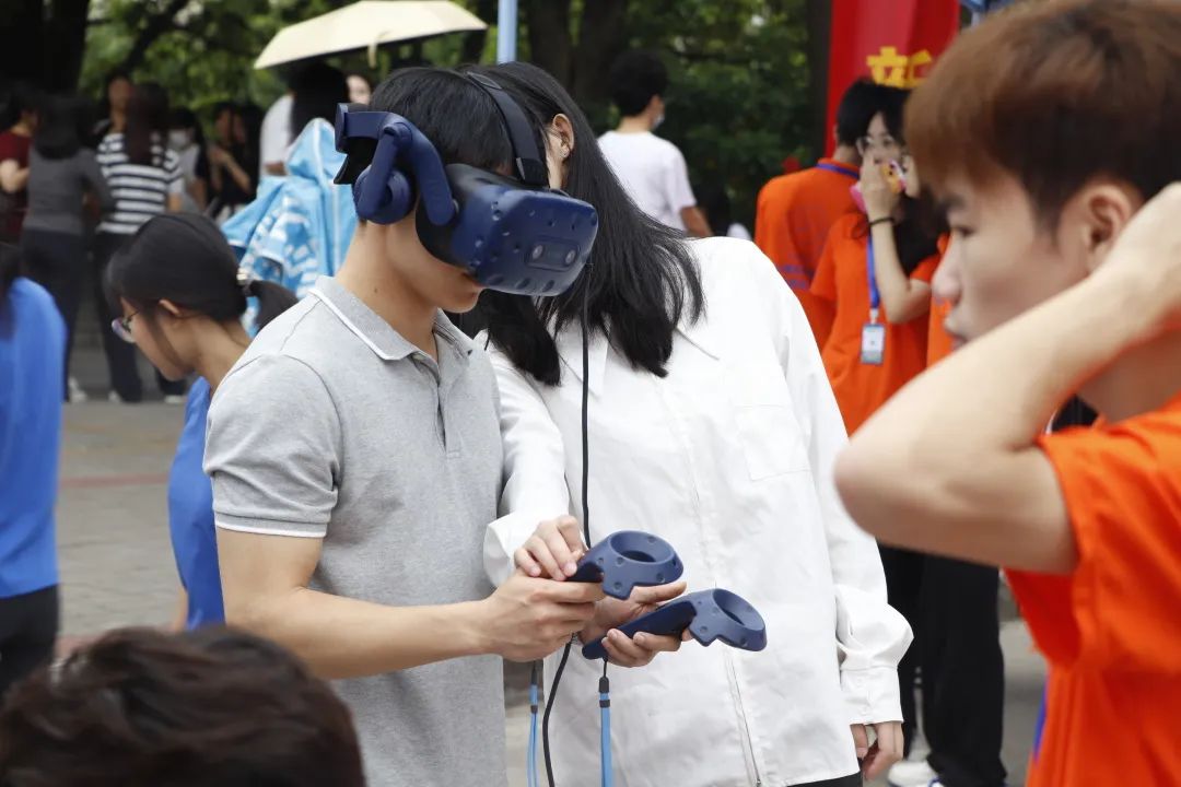 为了让同学们更加直观地体验到科技的魅力,我院将优秀同学作品带到了现场,供同学们参观体验。其中,VR项目深受大家的喜爱,吸引了大批同学驻足体验与观看。