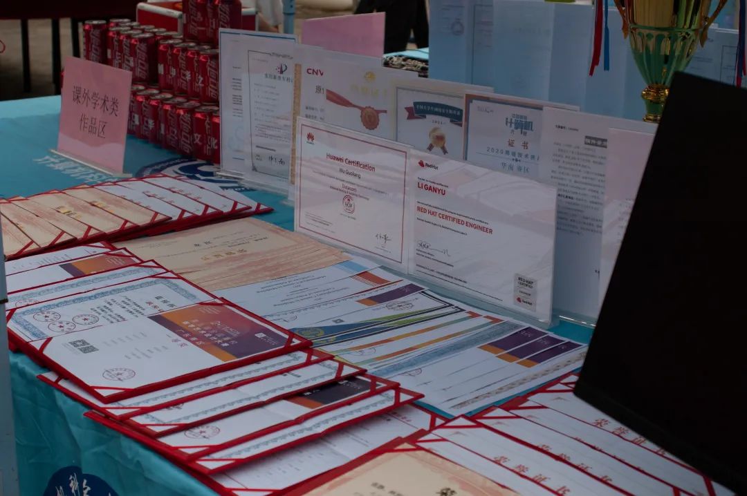在本次科技节中,我院展示了众多科技成果与学术作品,如创业赛、专利等。展区内陈列了各类科技奖项及奖杯。