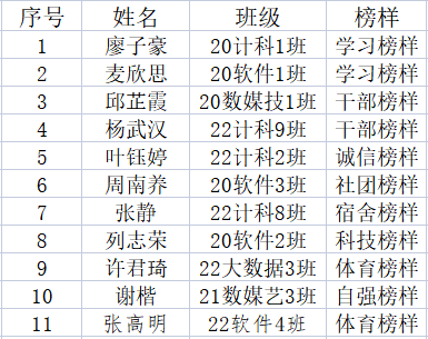 (通讯员:席宇欣)为深入发掘大学生典型,树立优秀学生榜样,激发学生追求上进的积极性,提高学生的看齐意识、向上意识和主动意识,大力选树新时代大学生先进榜样,推动我院良好学风建设,形成和谐的人际关系和浓厚的学习氛围。根据《关于开展2023年春季学期学风建设“八个一”专项行动的通知》(广州理工学函〔2023〕82号),经班级推荐,辅导员评选,学院审议,共评选出我院“榜样的力量”宣讲团候选人共11名,现将名单予以公示(排名不分先后),公示时间从2023年6月7日至2023年6月9日止。若有异议,请以书面形式向以下受理部门反映。反映情况时请签署真实姓名和联系电话,有具体事实,不签署真实姓名或不提供具体事实材料的,将不予受理。
