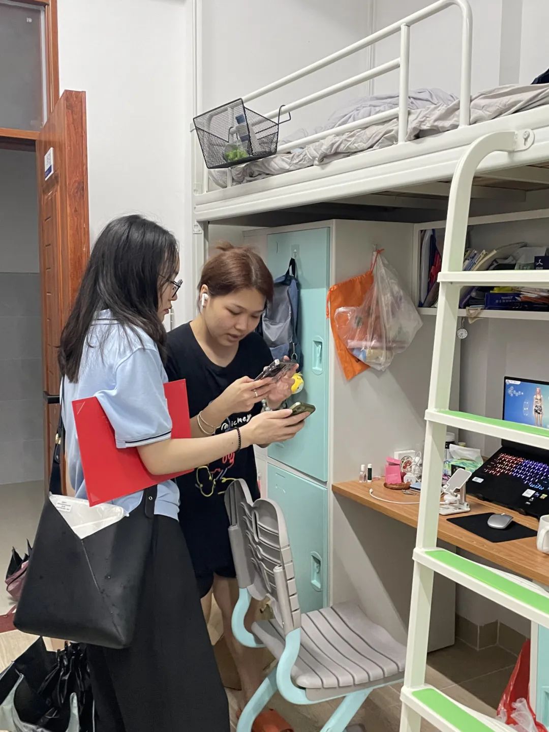 迎新第一天大雨滂沱,但辅导员们心系学生,担心新生们到了大学新环境可能会面临种种困惑和不安,所以一天工作结束后,他们连夜走进每一间宿舍,和新生们进行面对面的交流。走访过程中,学院领导老师细致了解新生们的生活情况,为他们送上温馨的问候,并详细介绍宿舍布局和安全事项,解答新生们的疑问,帮助他们更好地适应新的生活环境。在这次走访中,辅导员们不仅仅是给予了学生们温暖的关怀,更是倾听了他们的心声和反馈。新生们纷纷表示,在大学刚开始的时候,他们普遍面临许多适应困难和焦虑情绪,而辅导员们的到来给予了他们巨大的安慰和支持。