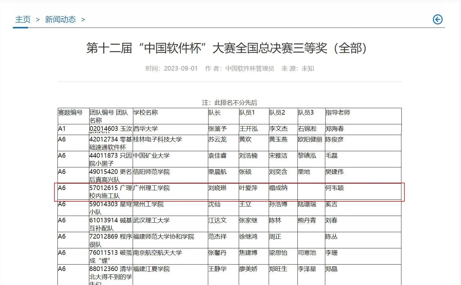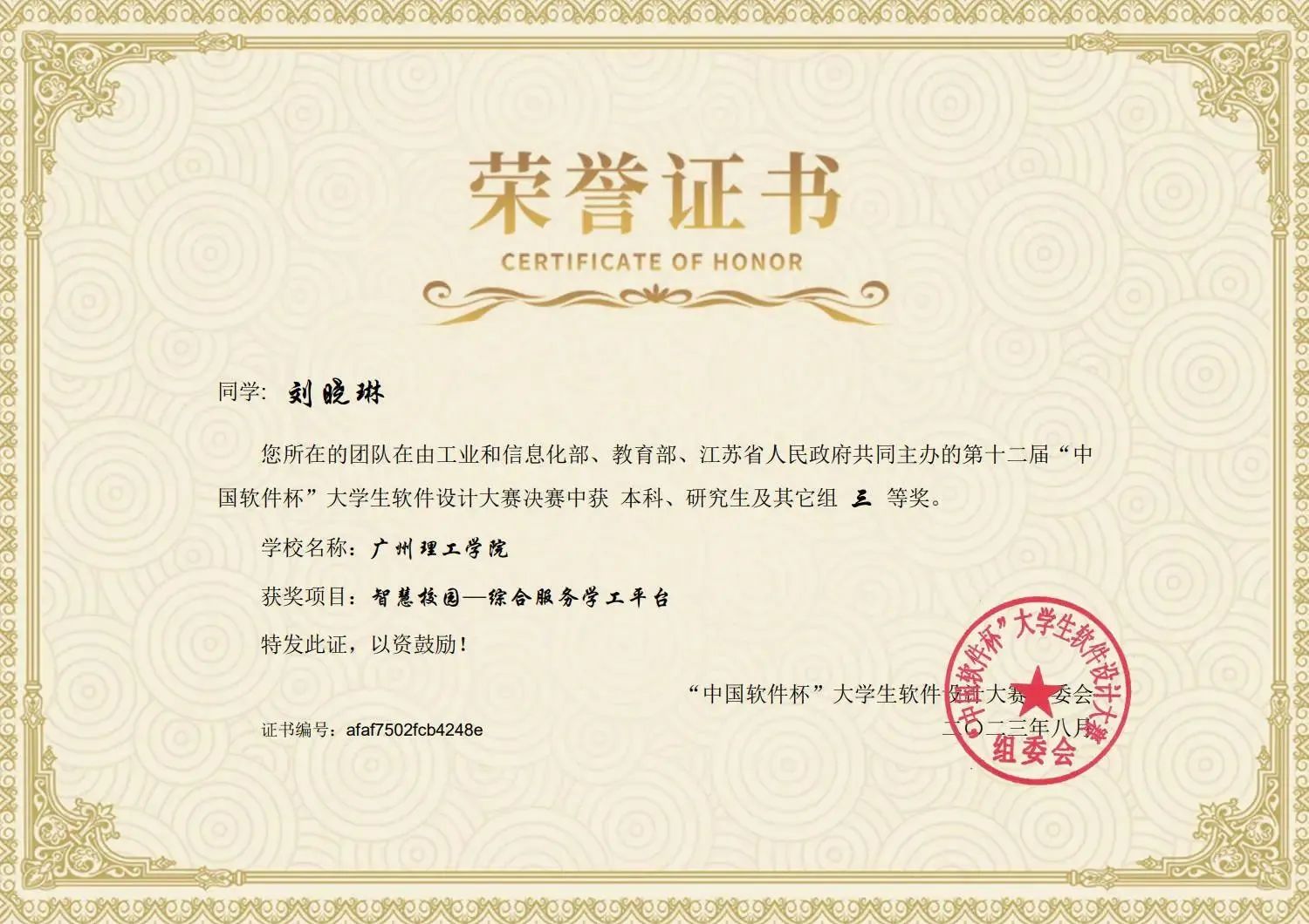 (通讯员:李风景 禤成纳)近日,第十二届“中国软件杯”大赛全国总决赛获奖名单终于揭晓,计算机科学与工程学院天软科技工作室何韦颖和周文剑老师指导的,由20级计科专业的刘晓琳、叶爱萍、禤成纳三位同学组成的“广理校内施工队”获得了A类赛事国家级三等奖!