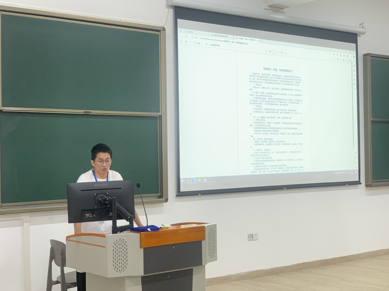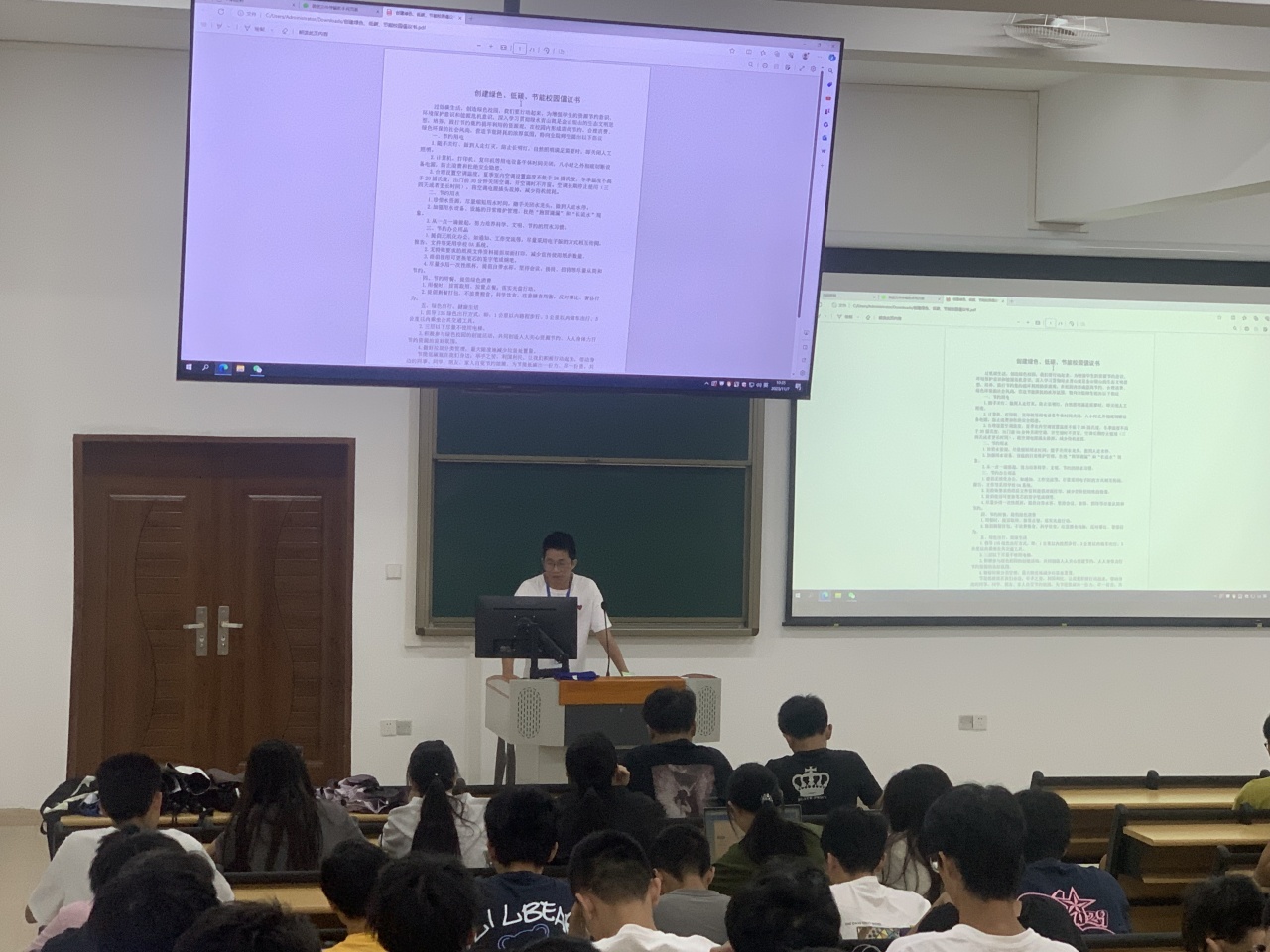 讲座中,李明老师带领全体学生阅读《创建绿色、低碳、节能校园倡议书》,对打造绿色、低碳、节能的校园提出倡导及建议;接着李明老师带领大家观看周铁君的纪录片《碳路森林》,此纪录片生动形象地介绍了环保的重要性和日常生活中的环保小技巧,让学生从身边到远方重新认识人与自然的关系。