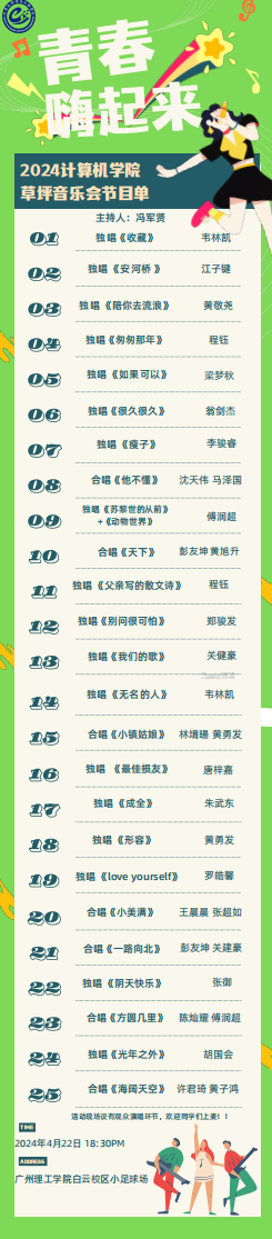 (通讯员:邱芝仪)为同学们提供一个展示才艺、交流文化的平台,同时也让大家在繁忙的学习生活中放松心情,享受音乐的魅力。我院将举办一场草坪音乐会,届时将为大家带来精彩的演出,音乐风格多样,既有流行歌曲,也有经典老歌,定能满足不同口味的观众。