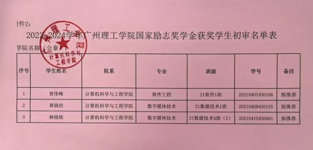 经学生本人提出申请、二级学院严格评选等程序,现对2023-2024学年国家励志奖学金候补的黄晓欣等3位同学名单予以公示。