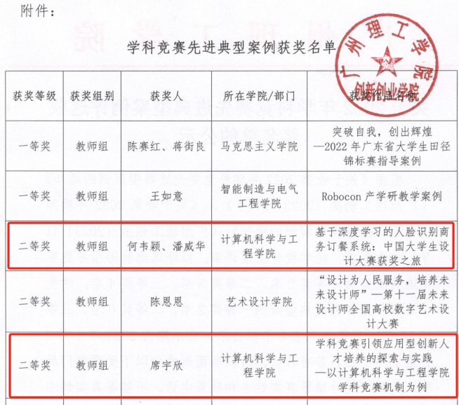 本次典型案例征集主要为我校全范围倡导师生参与各项竞赛提供经验启示,案例主要以教师团队的简要情况说明、获得的奖项、指导学生备赛过程的困难及解决措施、总结的先进经验和创新机制以及在参与竞赛方面的启示等方面进行阐释,以典型示范经验启示引领我校学科竞赛的全员参与、全面覆盖。以竞赛为契机,将创新创业教育植入专业教育,提升教学经验和教学方法。我院何韦颖老师案例紧密结合计算机专业,以深度学习技术为基础搭建人脸识别订餐系统,让学生在学习专业知识的同时拓展技术,培养计算机应用人才;席宇欣老师以学科竞赛为机制,探索应用型创新人才培育路径。