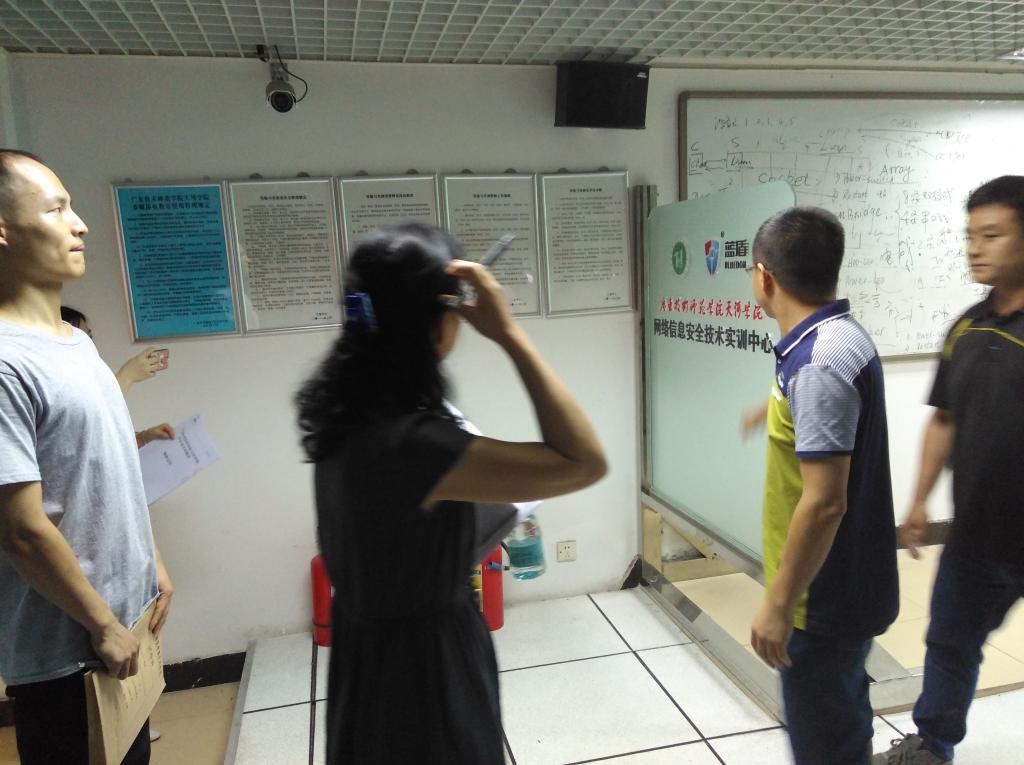 网络安全实验室在经学院内部论证后,再次迎来学校、学院和企业三方组成的专家组的验收检查。参与本次验收检查的人员有:学校设备处钟立华处长、黄贵明老师;资产处杨帆、梁好老师;采购办陈键聪老师;计算机科学与工程学院院长原峰山、副院长谌頏、陈易平老师;蓝盾信息安全有限公司尹经理等人。