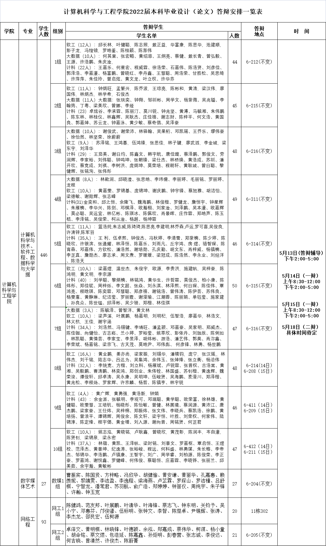 具体分组及答辩顺序见《计算机科学与工程学院2022届毕业论文答辩分组表》(附件)。