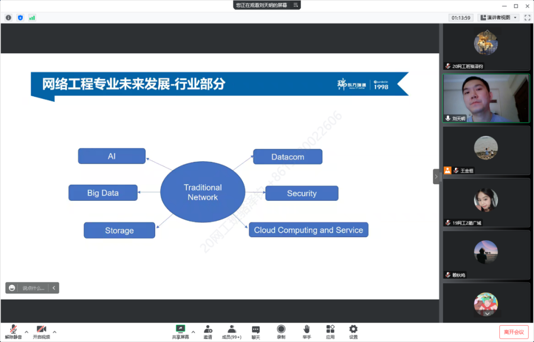 (通讯员:王金恒)11月10日下午,计算机科学与工程学院三全育人素质教育周专业教育类网络工程专业主题讲座通过线上的方式顺利开展,讲座由东方瑞通华为IE讲师刘天明老师主讲,网络工程系王金恒老师主持,网络工程专业全体同学在腾讯会议认真听取了本次讲座。
