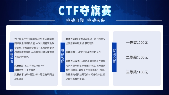 “国家安全,人人有责”、“爱校护网,人人有责”。由广州理工学院计算机科学与工程学院主办,天网工作室承办的“护网行动之网络安全CTF夺旗赛”将于素质教育周在校举行,欢迎所有感兴趣的同学踊跃报名参加。参赛的同学不仅可以获得学习锻炼的机会和丰厚的奖金,还有素质教育周4个学时的学分。赛事详情如下:
