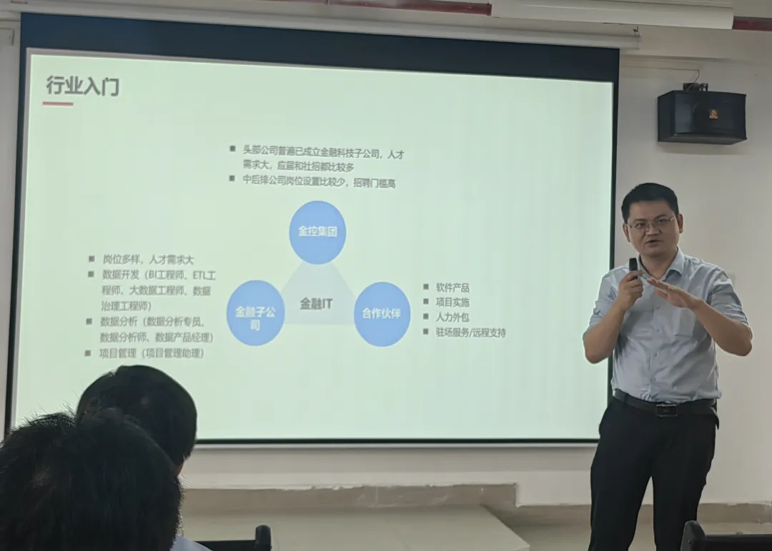 讲座最后,美林大数据华南区域申健总经理也对大数据专业学生实习实践以及发展规划,以个人亲身经历开拓同学们就业认知与职业就业发展规划的视野。并告知同学们实习、就业、择业过程中企业对从业都挖的各种“坑”,只有将自身专业技术打磨扎实、具备项目综合应用技能,才能筛选出“黄金坑”。