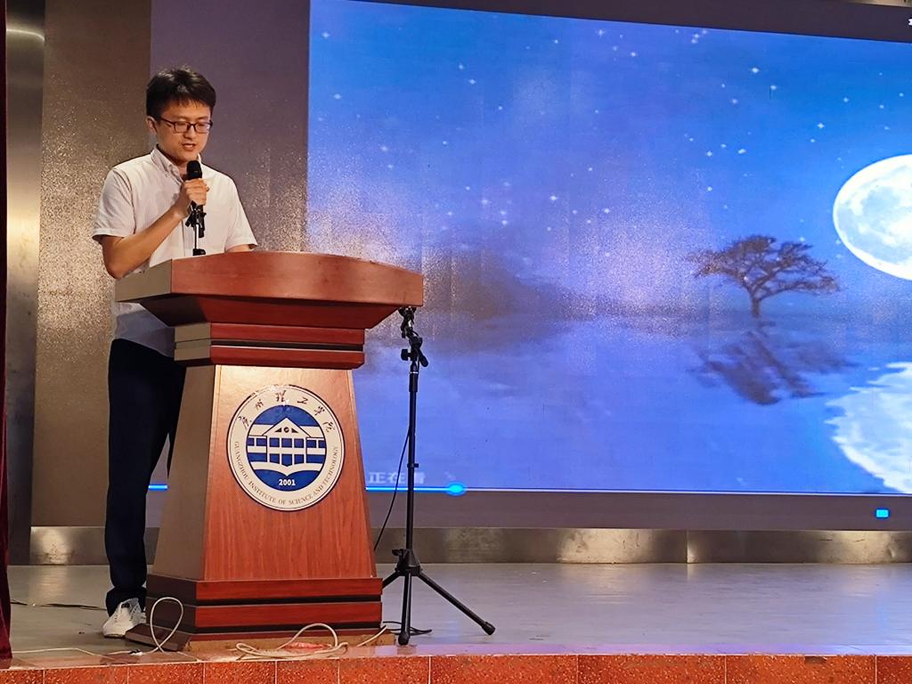 比赛包括自我介绍、经典诵读和即兴演讲三个部分。我院首先出场的是陈朝阳老师,朗诵题目为《春江花月夜》,他搭配唯美的月色图,展示了大自然的美景和游子的思乡之情,他在即兴演讲环节论述了对节约的看法,提倡绿色低碳出行。学院第二位出场的是席宇欣老师。席老师身着红裙,朗诵《人生若只如初见》,搭配着优雅的小提琴,展示出初见的欣悦,再见的惘然。最后出场的杜金鹤老师现场朗诵了《致橡树》,把他对教育事业的热爱,对理想的坚定,都揉到诗里揉到每一个字里行间。