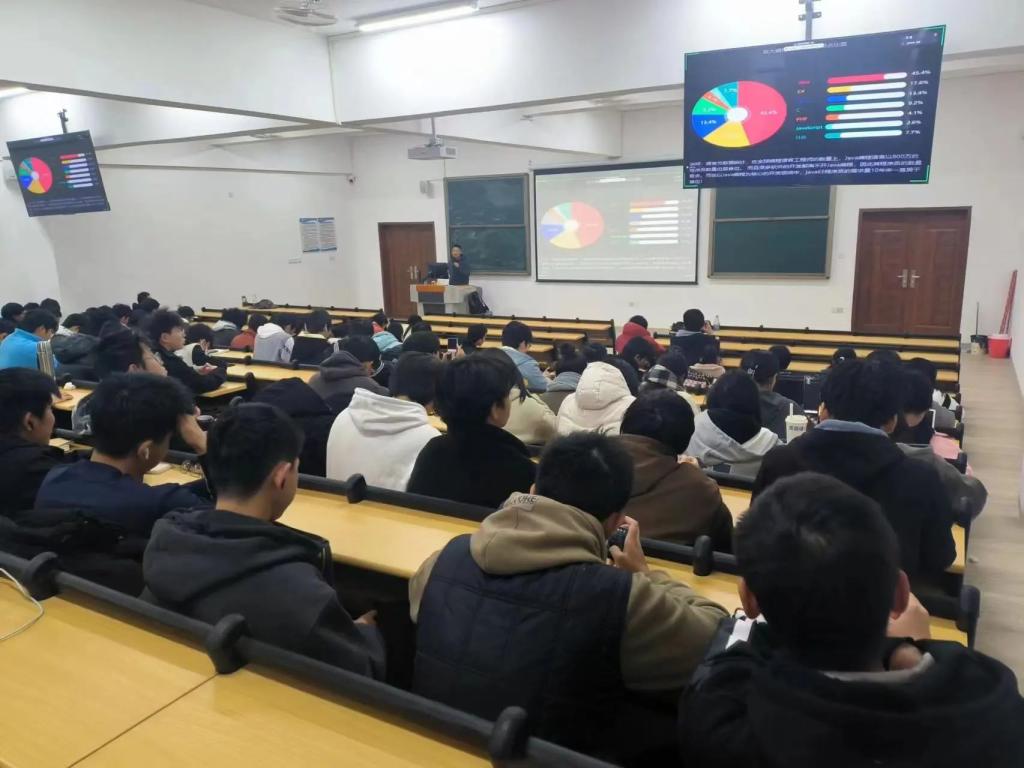 会上,讲座首先从粤港澳软件产业发展现状展开,随着疫情结束,粤港澳大湾区软件产业仍是蓬勃发展,广东软件行业从无到有、从弱到强,实现万亿突破。截至2022年,广东软件企业超6000家,从业人员逾百万。软件出口、利润总额、PCT国际专利申请量、软件著作权登记量等均位居全国首位,粤港澳大湾区对软件开发人才缺口还是非常大的。随后,工程师曾运扬从前端工程师、移动端、后端工程师和全栈工程师这4个职业岗位,向同学们介绍了软件编程的发展趋势和未来方向,并且分析了目前就业形势、所学专业的就业优势及适合人群,举例直观介绍了前端开发、后端开发、人工智能、信创等相关内容。