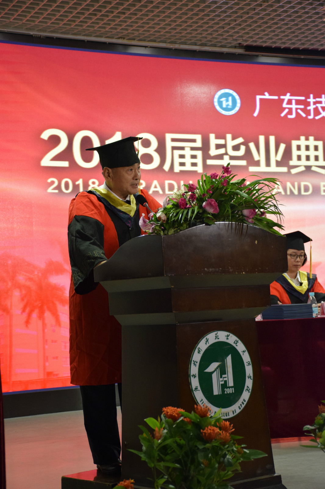 伴随着庄严的歌声和耀眼的聚焦灯光,计算机科学与工程学院院长原峰山高举着学术权杖,带领院学位评定委员会全体委员和2018届全体毕业生缓缓进场,全场起立,注视着权杖前进,行注目礼。入场完毕后,主持人宣布毕业典礼正式开始,全体起立,奏国歌。然后,现场毕业生代表为教师代表、家长代表献花。
