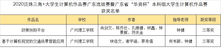 (通讯员:钟健)2020年9月25日,2020泛珠三角+大学生计算机作品赛广东选拔赛暨广东省“华资杯”本科组大学生计算机作品赛在广东科学馆举行。我校计算机科学与工程学院学生林浩文、谢宇涵、蔡奇倡的《基于计算机视觉的交通场景智能应用》(指导老师:何韦颖、钟健),肖剑文、陈乔仕等同学的《政策扶助平台》(指导老师:钟健)两项作品均荣获三等奖。
