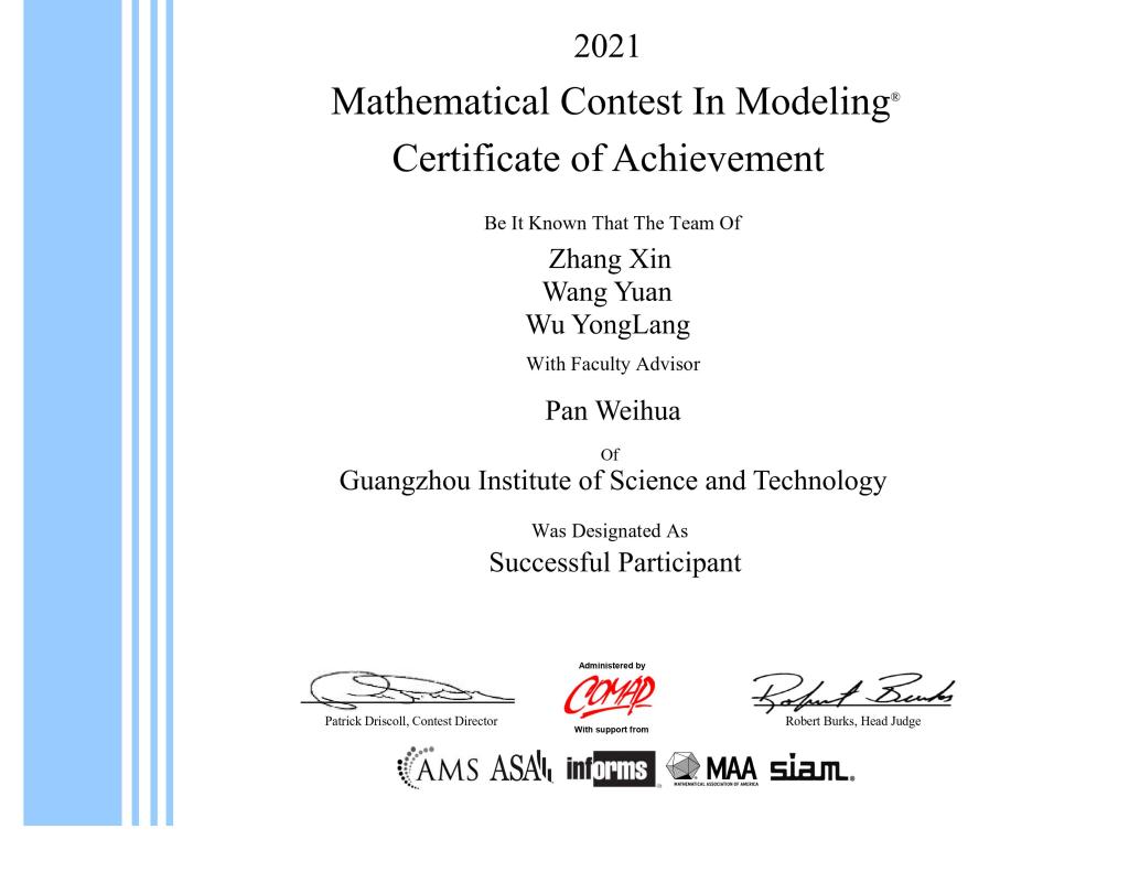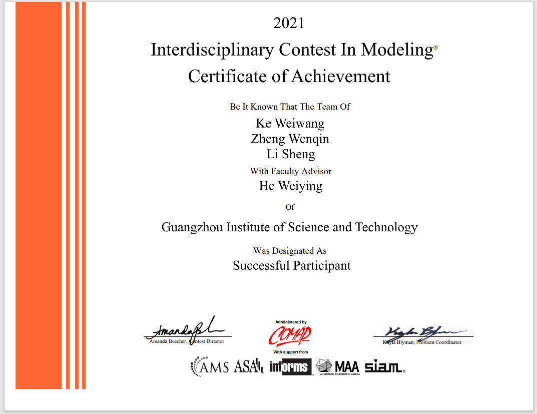 在备赛中,我院领导和老师高度重视,积极协调各类资源做好保障服务。参赛队员则根据自己的能力特长,合理分工、认真训练。正式比赛虽受到疫情影响,队员们无法集结,但各队员利用网络平台克服了沟通协作的困难。在年初主办方公布选题后,两支队伍在仔细研究各个题目后,最终分别选定了B组和E组赛题。接着在四天四夜96个小时里,队员们就赛题的指定问题积极搜索了文献资料、运用各种计算机技术及数学方法建立了问题的求解模型,并验证了模型的合理性,得到赛题结果后将数学模型撰写成了全英文论文,最后按时向主办方提交了论文。4月23日,美数建模竞赛揭晓竞赛结果,我校喜获2项SuccessfullyParticipation奖(三等奖)。