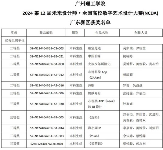 (洪育丹)近日,第12届未来设计教育论坛暨未来设计师大赛颁奖典礼在重庆举行,在师生的共同努力下,我校荣获优秀组织奖,获邀参加颁奖仪式。2024年第12届未来设计师全国高校数字艺术设计大赛,共吸引了全国1891所高校参赛,征集作品数量高达298763件。我院数媒专业学子凭借出彩的创意能力和扎实的技术基础,荣获全国赛三等奖1项、广东省赛二等奖5项、三等奖6项。