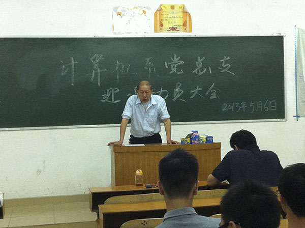 2013年5月6日晚上19:30分,计算机系党总支在图书馆509教室召开全系学生党员大会。迎评工作党员动员大会由刘元俊书记亲自主持。首先,刘元俊书记发言,由学生党支部委员郑泽群和刘骁刚宣读了党委和团委的文件。然后,系党总支委员袁桢强发言,指出教学状态评估工作的重要性,详细说明迎评工作的内容,希望学生党员认真做好迎评准备工作。最后,刘元俊书记在动员大会上对全系的学生党员提出了具体要求。刘书记列举关于考勤、教室卫生和宿舍等方面的情况,重申党员要带头严格遵守校规校纪违纪,在迎评工作中起好模范带头作用,以身作则,同时要带领其他同学把迎评工作搞好。