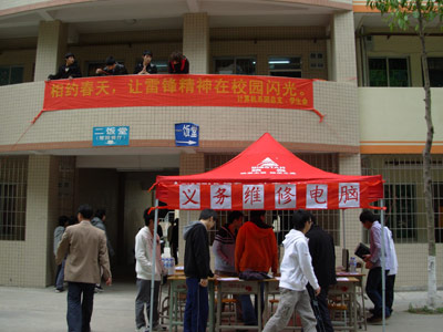2011年3月23日在天河学院8栋学生宿舍楼下,计算机系举办的学习雷锋义务维修电脑活动在同学们的赞扬声中圆满结束。为了弘扬雷锋精神,为同学们服务,我系学习部组织了这次义务维修电脑活动。参加活动的同学发挥自己的专业特长,满腔热情地为前来咨询和送修电脑的同学服务。到下午五点活动结束,共帮同学们调修电脑10余台次,回答同学们电脑使用和维修等咨询20多人次。在整个活动中,同学们在帮助别人的同时,也收获了学习雷锋精神,助人为乐的快乐,检验了自己所学专业对就业前途的展望。在同学们的赞扬和欢乐歌声中,义务维修活动落下了帷幕。
