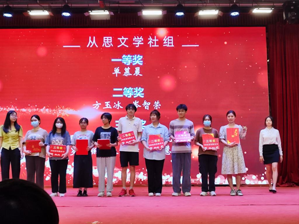(席宇欣)6月2日下午,由学校举办的2023年“校友杯”征文比赛颁奖典礼在一号报告厅举行,9428cn太阳集团古天乐王金恒、席宇欣老师获得“教师组”三等奖,20计科7班洪泽洋同学获得“学生组”三等奖。出席本次颁奖典礼的有常务副校长伏焕昌、党务副书记肖海、校办主任黄菲青等领导、从思文学社优秀校友张文舒、钟翰青等人以及来自各学院的参赛选手等。