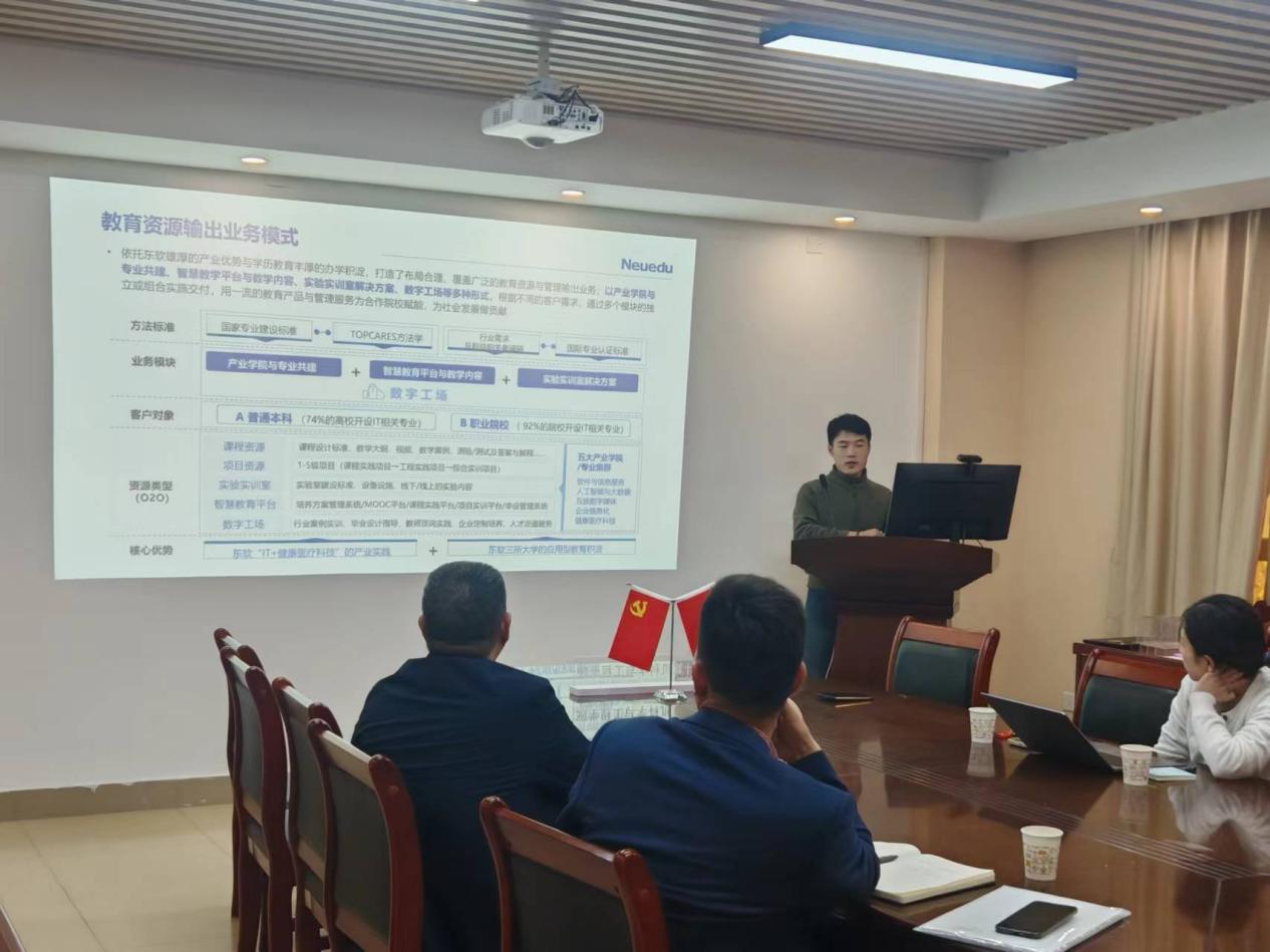 赵玉刚主任重点关注实践教学基地建设、学生实习安排及就业率提升等核心议题。他指出,构建稳固的实践教学基地是学生将理论知识转化为实践技能的关键平台,期望东软集团能提供更多实习岗位和项目资源,使学生在实际工作中得到锻炼。赵主任还强调,学生就业率是评估校企合作成效的核心指标,希望借助东软集团的行业影响力,拓宽学生就业渠道,增强毕业生的职场竞争力,最终实现学生、学校、企业三方的互利共赢。
