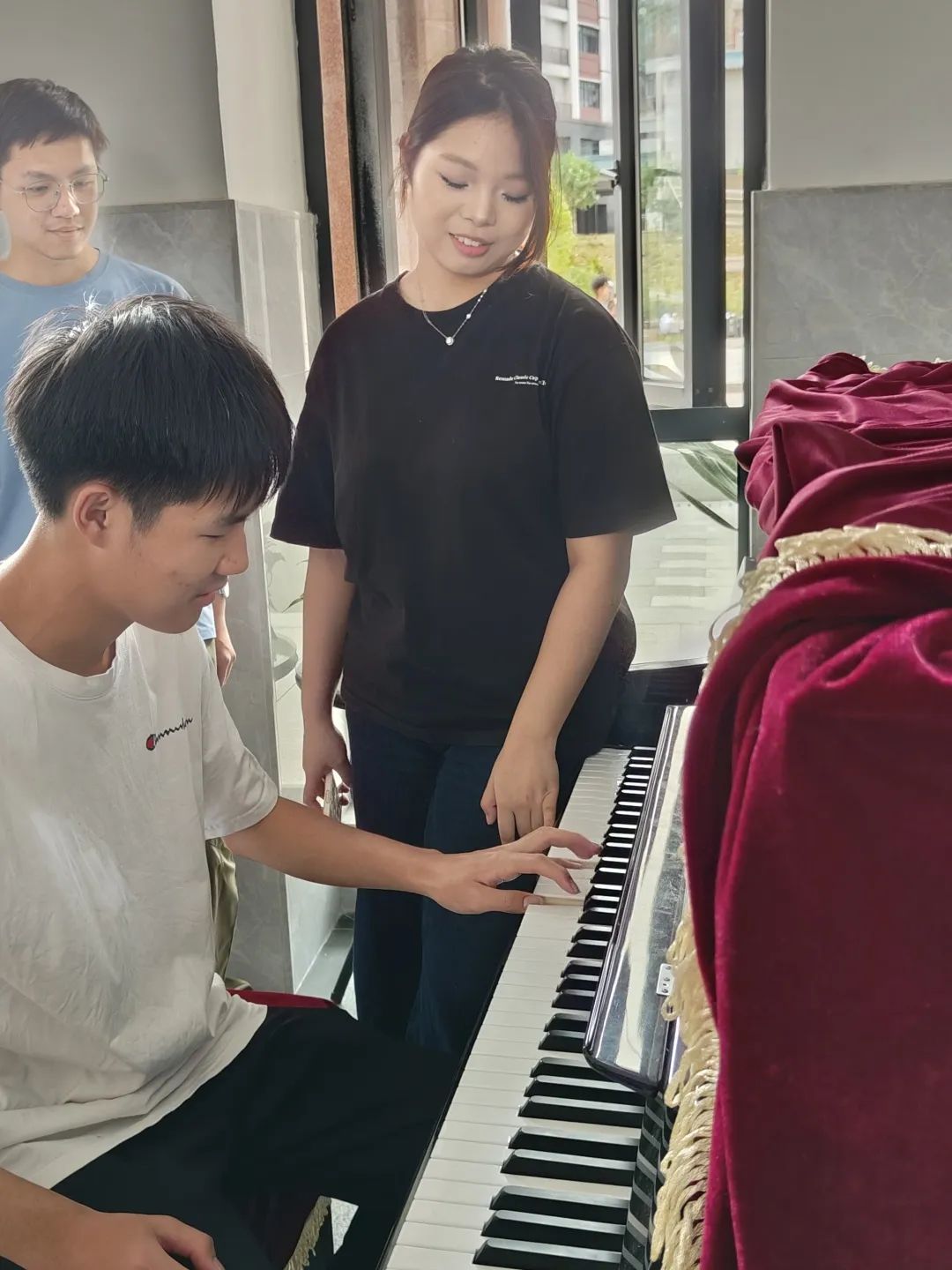 本次活动特别邀请音乐舞蹈学院优秀学生代表卢雯靖、刘知越同学,面向零基础学生开展钢琴与古筝入门教学。现场设有钢琴、古筝两个教学区域,同学们通过分组方式学习钢琴和古筝两种乐器。钢琴教学中,卢雯靖同学从基础指法入手,指导同学们学习《小星星》《两只老虎》等经典入门曲目,随后通过一对一指导,帮助大家更好的掌握节奏与弹奏技巧。