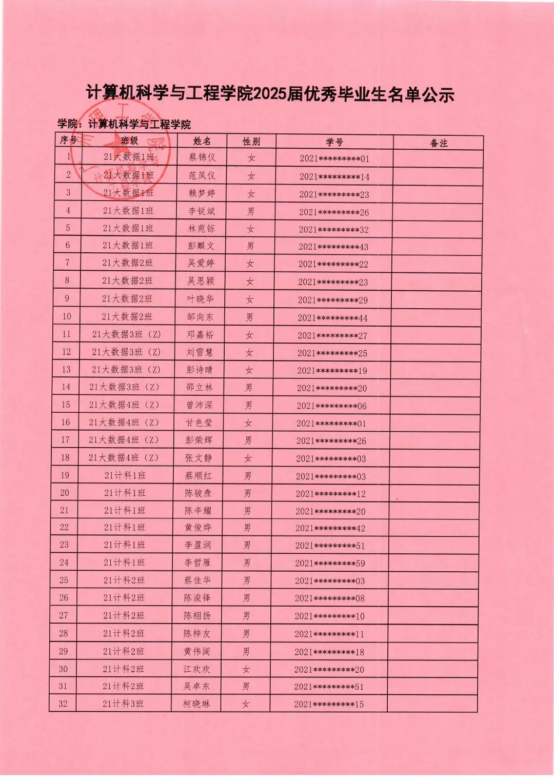 根据《(广州理工办函〔2025〕29号)关于评选2025届优秀毕业生的通知》文件精神,经个人申报、班级评议、学院评审,共评选出蔡锦仪等239名同学为计算机科学与工程学院2025届优秀毕业生(具体名单详见附件)。现予以公示。