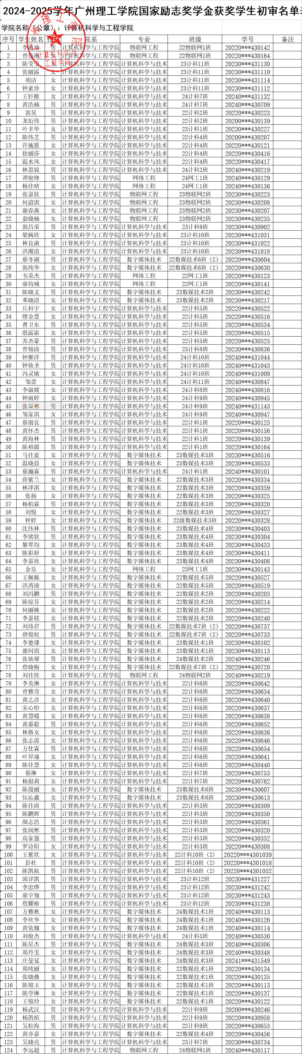 根据《关于开展2024-2025学年国家励志奖学金评选工作通知》(广州理工学助函〔2025〕11号),经学生本人申请及学院评议,现将我院2024-2025学年国家励志奖学金拟推荐名单予以公示。公示期为2025年9月25日至9月28日,共计3个工作日。如对公示有异议,请在公示期内向辅导员老师反馈,或以书面形式并署真实姓名投信到信息楼309办公室旁信箱或电子信箱jsjxy@gzist.edu.cn反馈,也可致电9428cn太阳集团古天乐办公室:020-87477070。