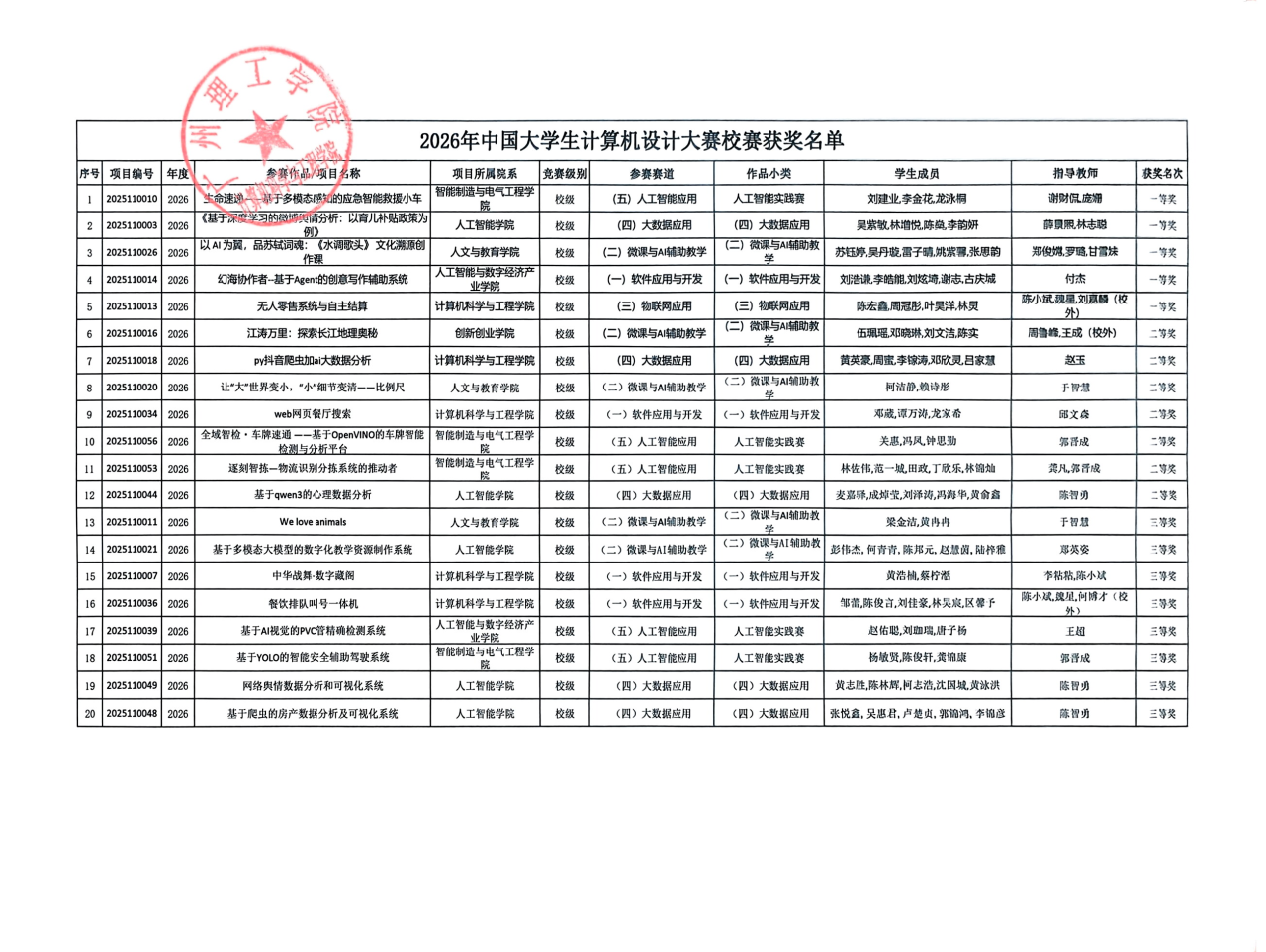 根据《广州理工学院办公室关于举办2026年中国大学生计算机设计大赛校赛的通知》,学校组织了2026年计算机设计大赛,共计收到参赛项目71项。经专家评审,分别评选出一等奖5名、二等奖7名、三等奖8名、优秀指导教师5名。获奖名单公示如下,公示期为2025年12月1日至12月3日。